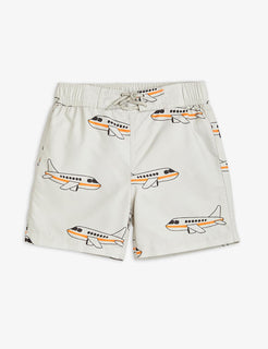 Grey kids swim shorts with all over Airplanes print, made from 100 % recycled polyester.