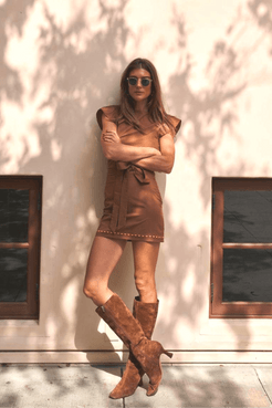 A classic mini, fitted to beautifully hug the body, this rich-toned brown mini skirt is a piece of timeless clothing for modern women. Infused with an optimistic spirit through its embroidered trim, it’s clothing that enhances mood with every wear. Perfect for elevated everyday wear, this skirt offers a blend of style and sophistication, embodying modern elegance.