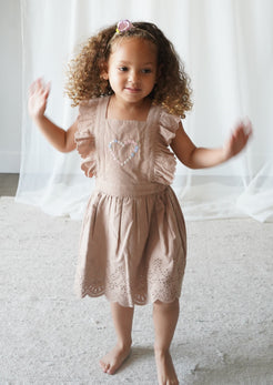 Details 100% Corduroy Cotton with anglaise embroidered detailing throughout. Cross-back with 3 cm of adjustable length to grow with child. Elastic waistband, comfortable skirt fit, with cotton lining.