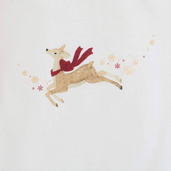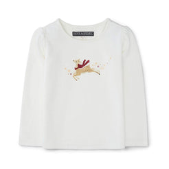 She'll be ready for the holiday season in this sweet and simple long sleeve graphic tee. Featuring slight puff sleeves and a sweet prancing deer graphic on the center front chest.