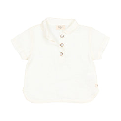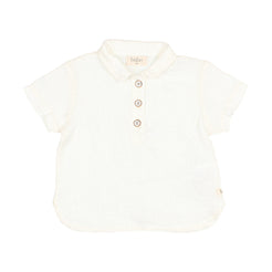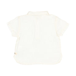 Washed linen short sleeve shirt that fastens at the front with wooden buttons.
