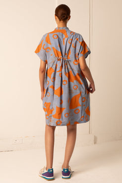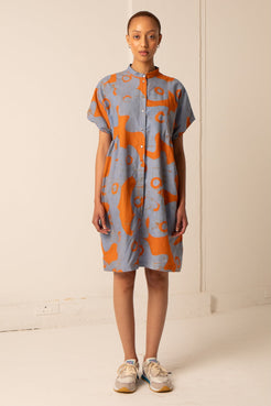Our very popular loose fitting cotton Bata dress has a mandarin collar and a button front. Back cinch tie and gather ...