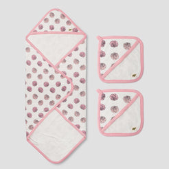 We have all the cozy feels for our oversized, hooded towel— plush white terry on one side and stripes on the other. With a roomy hood to keep just-washed-noggins warm. Paired with two of our super soft, organic washcloths are hands down the best. A triangle mitt opening makes them easy to hold onto while lathering your baby.