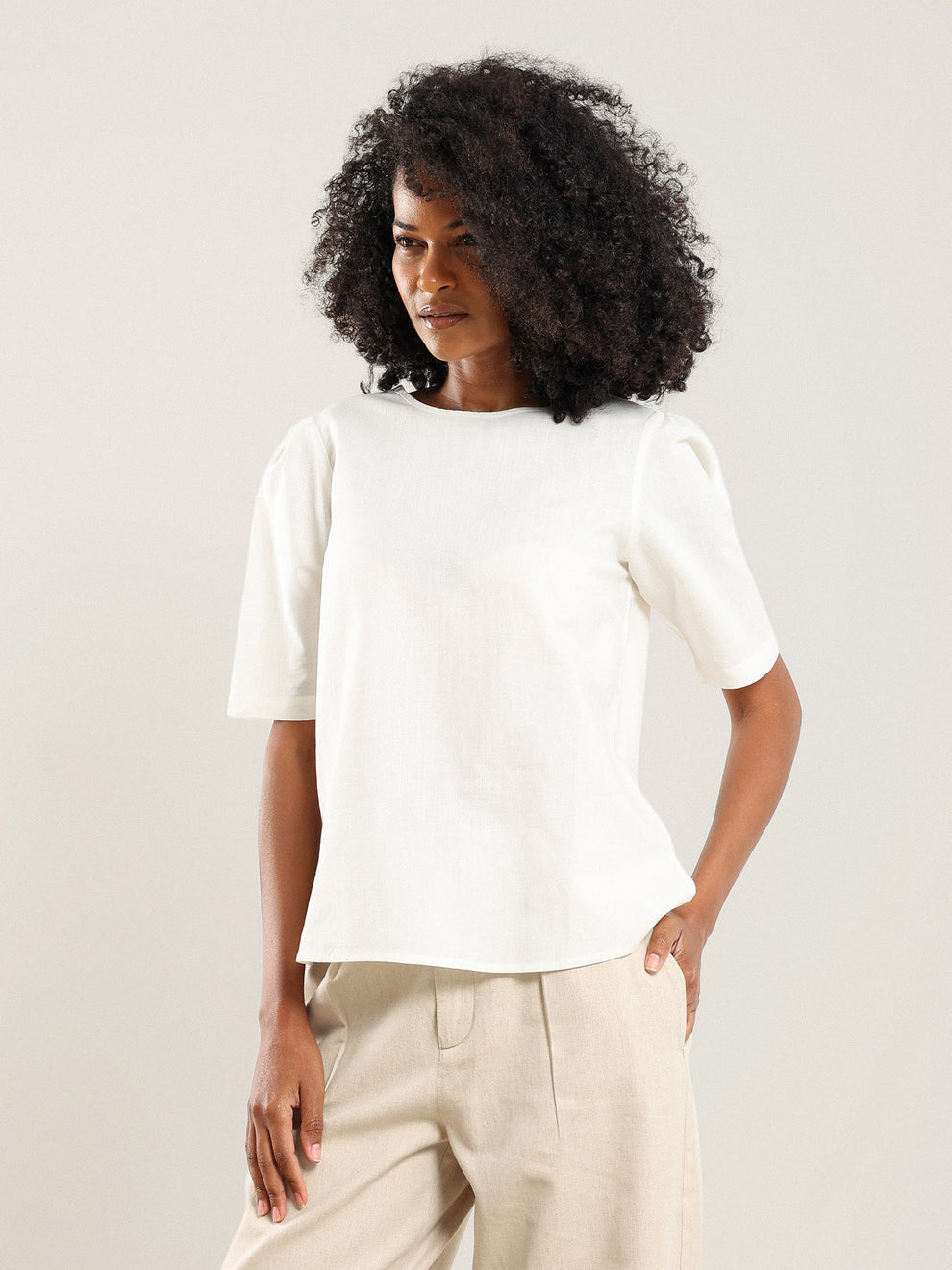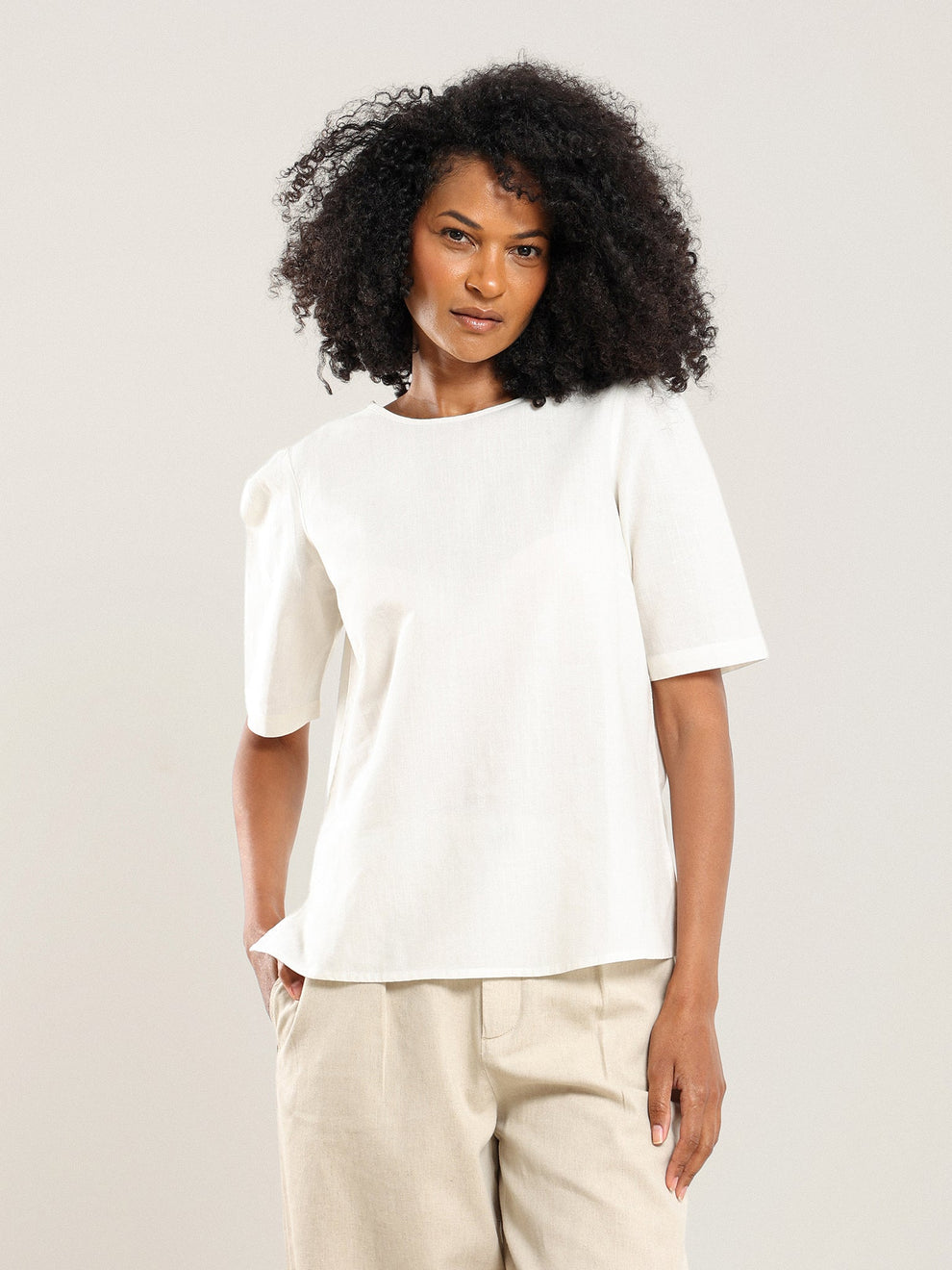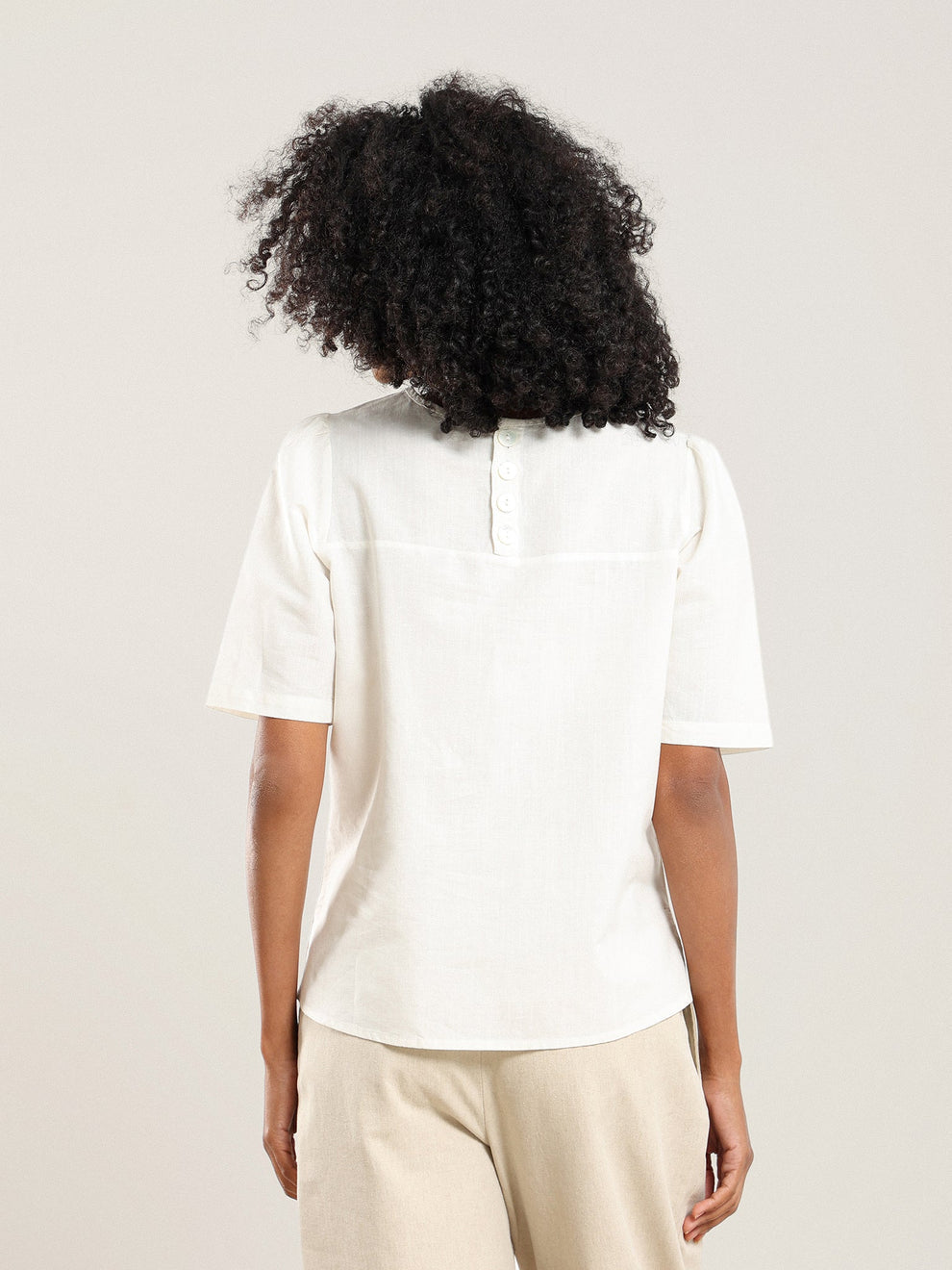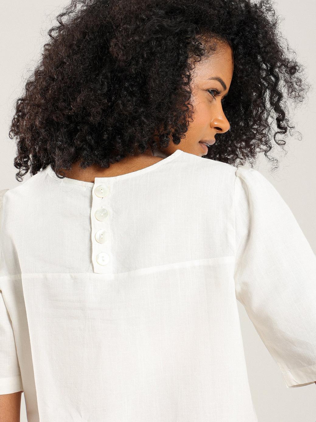 A soft and airy short sleeve blouse with jewel neckline and oyster shell button closure on the back.