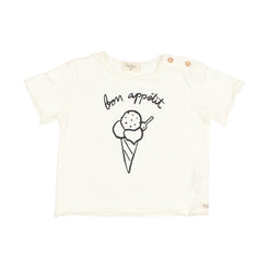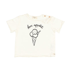 This short sleeve bon appétit t-shirt with ice cream print positioned on the chest has two buttons on the shoulder for easy neck opening.