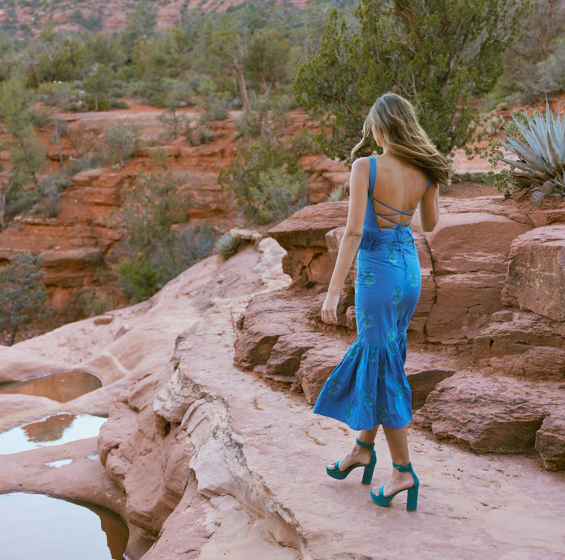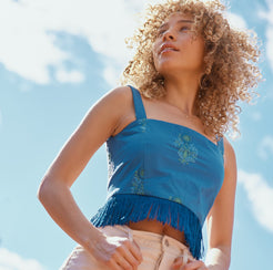 Satin ribbon details the back, offering a beautiful juxtaposition to the fun fringe that dances on the hem. This top pairs incredibly well with our fluted skirt.