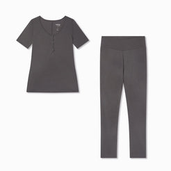 Our Maternity & Nursing Pajamas are made in the softestlyocell with natural stretchfor comfort. Side slits on the top mean itadapts to your growing and changing shapethroughout pregnancy and post-partum and buttons down the front offereasy access for feeding or pumping. The bottoms have anelasticated waistbandto be worn under or over your bump. They have a tapered shape for a stylish look & feel.