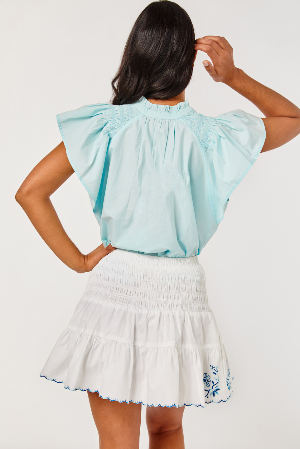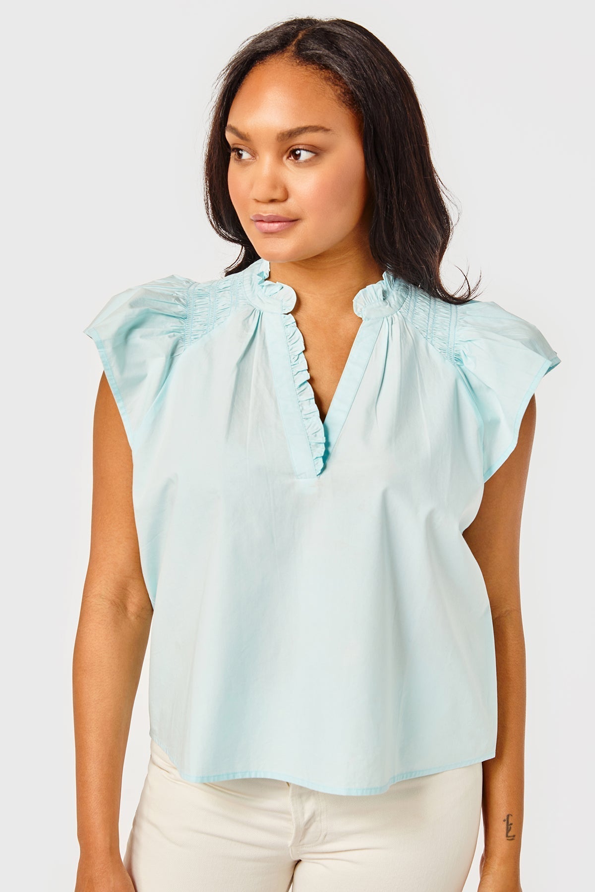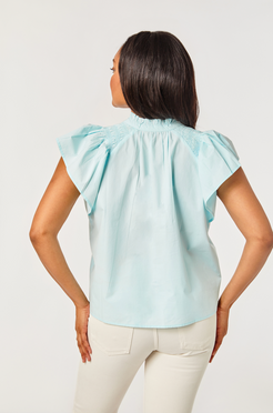 The Caitlin top is slightly A-line with a raglan flutter sleeve and smocking on the shoulders. She is easy to wear and can be worn with your favorite skirt or a pair of jeans.