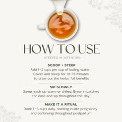 Steep 1–2 tsp per cup in hot water for 5–10 minutes. Enjoy warm. Safe for use throughout pregnancy and postpartum unless otherwise directed by your healthcare provider.