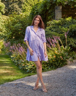 Made in our stretch cotton poplin, the Cammie Shirt Dress features a feminine touch of ruffle trim on collar and skirt, 3/4 length sleeve with an option for adjustment with a roll tab. This lightweight, easy dress will be your go-to all season long.
