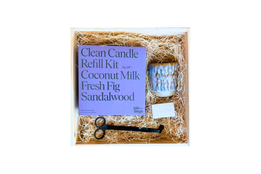 Each gift box includes: • Reusable Ceramic Candle Jar (choose from Cloud, Evergreen, or Earth) • Siblings Candle Refill Kit • Box of Matches • Candle Wick Trimmer • Reusable Wooden Gift Box with Lid and Excelsior Filling