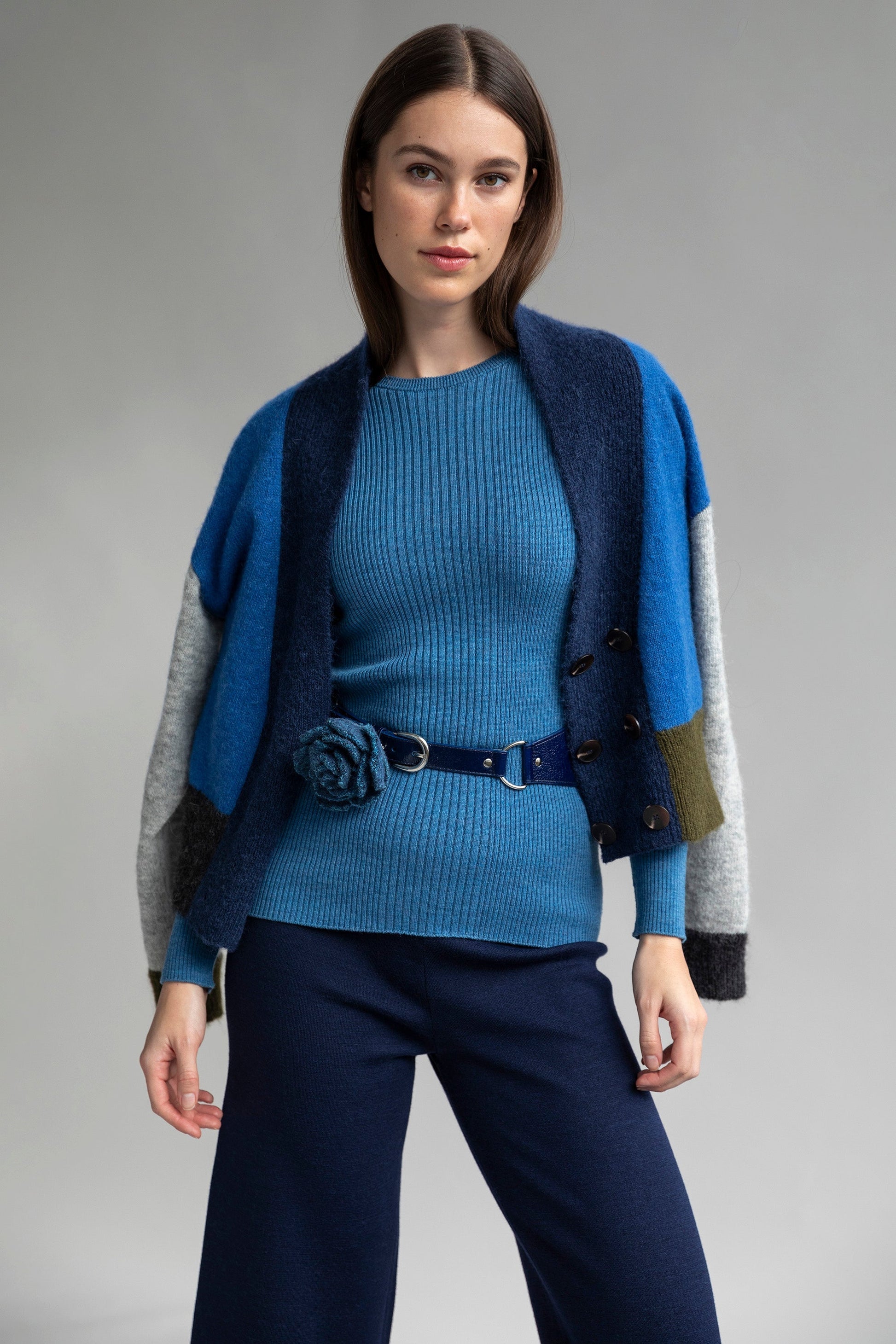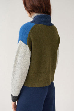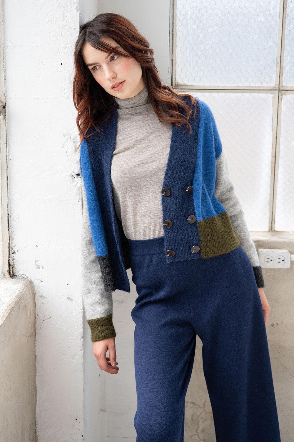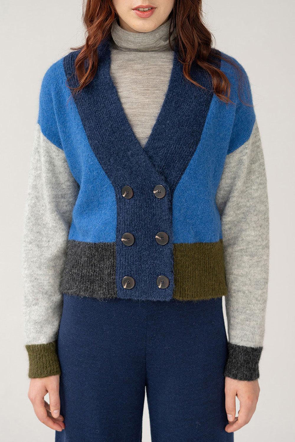 Introducing our updated best-selling cardigan featuring a color block design in rich, vibrant hues. This relaxed, boxy-shaped cardigan is knitted with a superfine alpaca blend yarn that lends it a subtle texture. The double-breasted placket can be buttoned into a single row for a more spacious fit. Ribbed details adorn the cuff, hem, side seam, and placket.