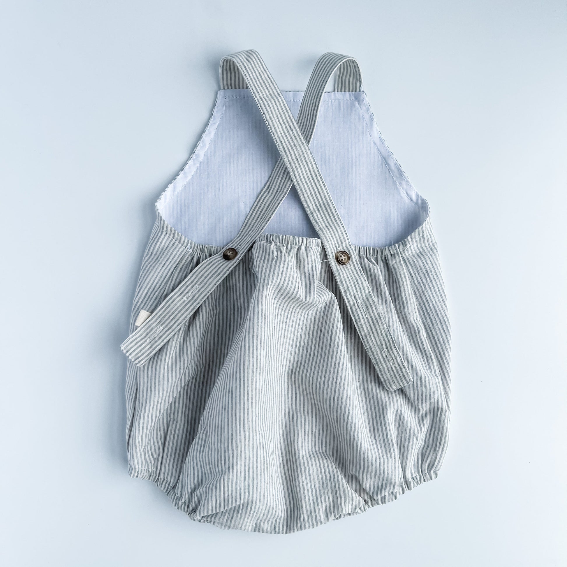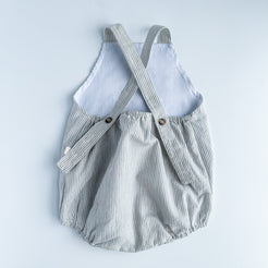 Super soft vintage inspired gender-neutral grey striped cotton bubble, lined in white cotton with adjustable button holes to customize fit and beautiful tortoise shell button detail at back. Perfection on its own in warm weather. Pairs well with cozy tee in gray or oatmeal knit for cooler temps. Lovely on girls with Peter Pan liberty floral shirt. Snaps at bottom for easy changes. This style will carry you easily into summer. Truly an heirloom piece. This item is a favorite of In Style editor, Laurel Pantin, whose little Phoebe couldn't look any cuter. Sizes 0-3m-2/3y 100% cotton Machine wash, tumble dry low.
