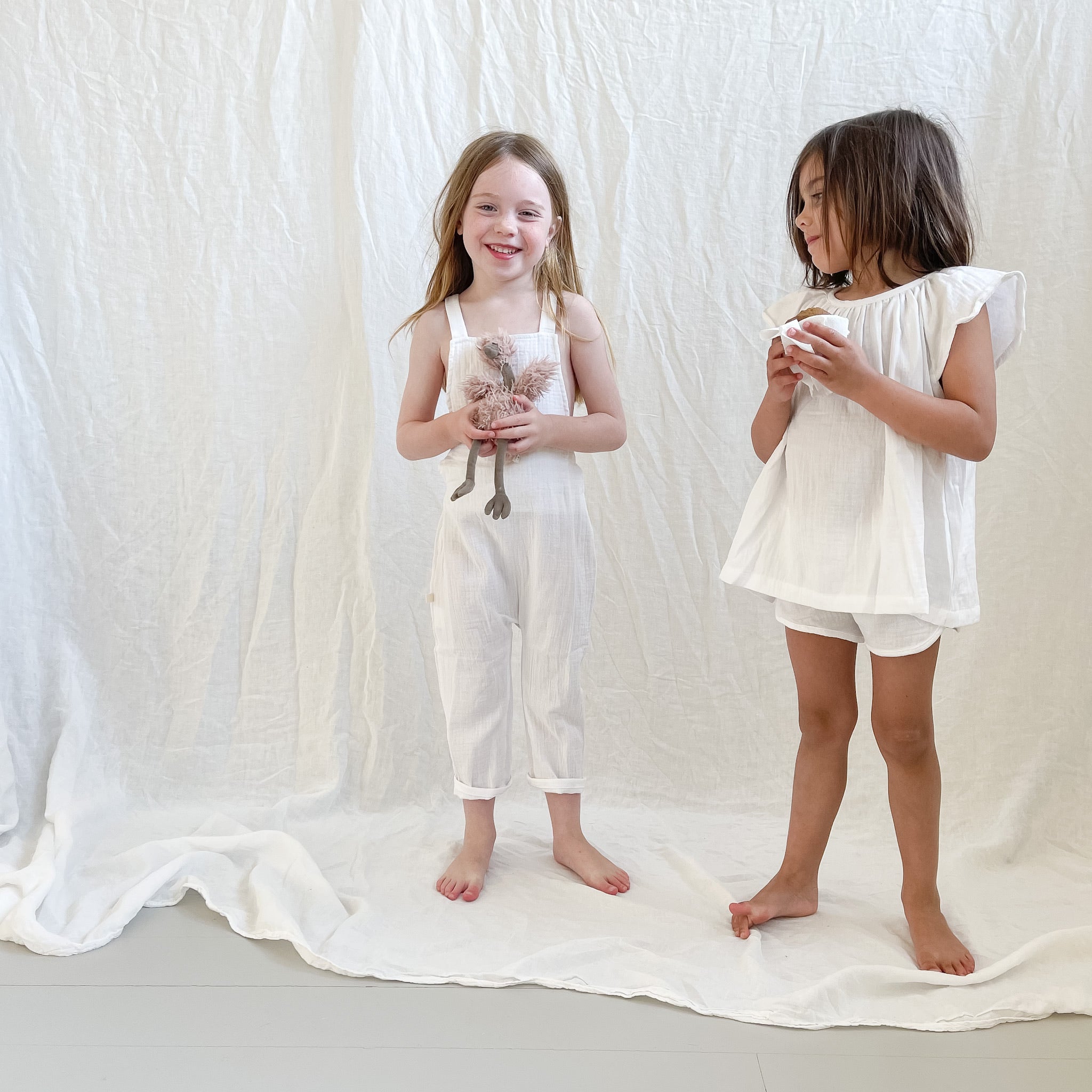 Part of our ORGANIC COLLECTION, our gauze overalls are a Harbour classic and we just can't get enough of them. Super soft double gauze, gets softer with every wear and wash. Wear as is in the warm sun or add our long sleeve cozy tee in the colder months. We love these with the legs rolled up a little--bare feet add extra cuteness. Gender neutral. 100% Organic Cotton
