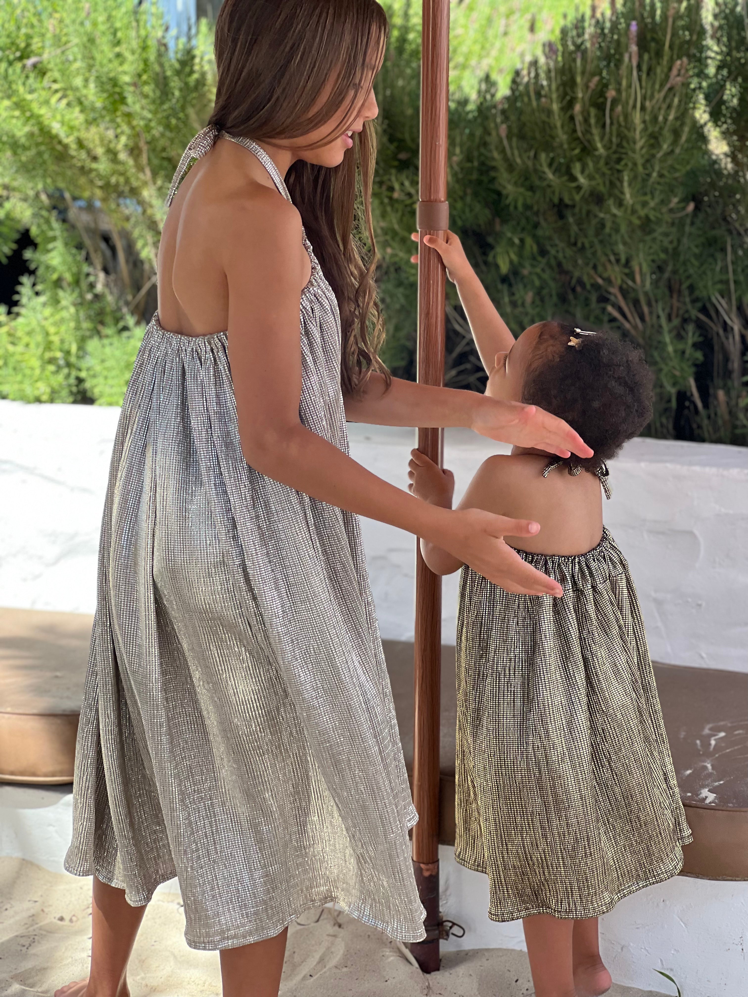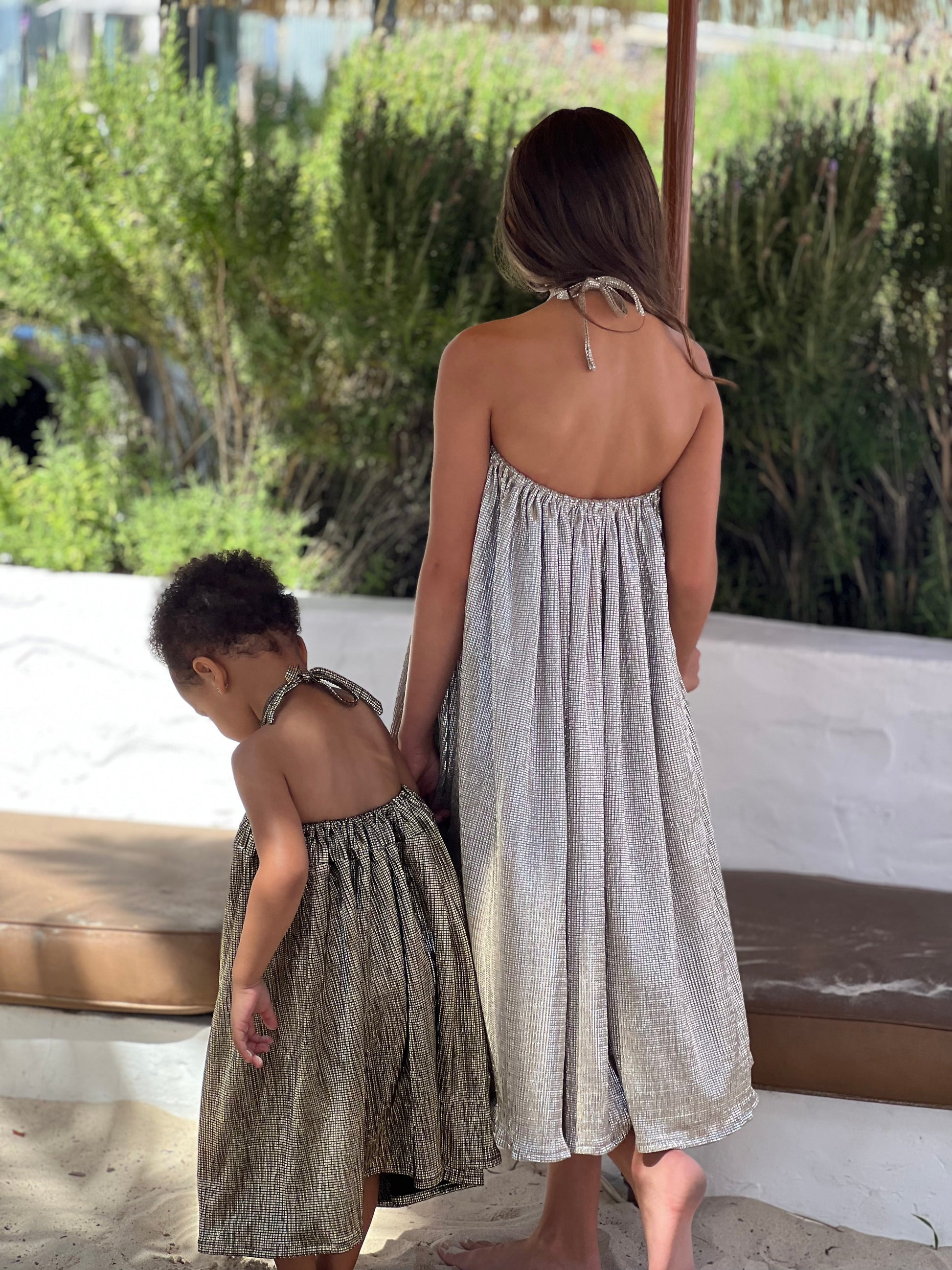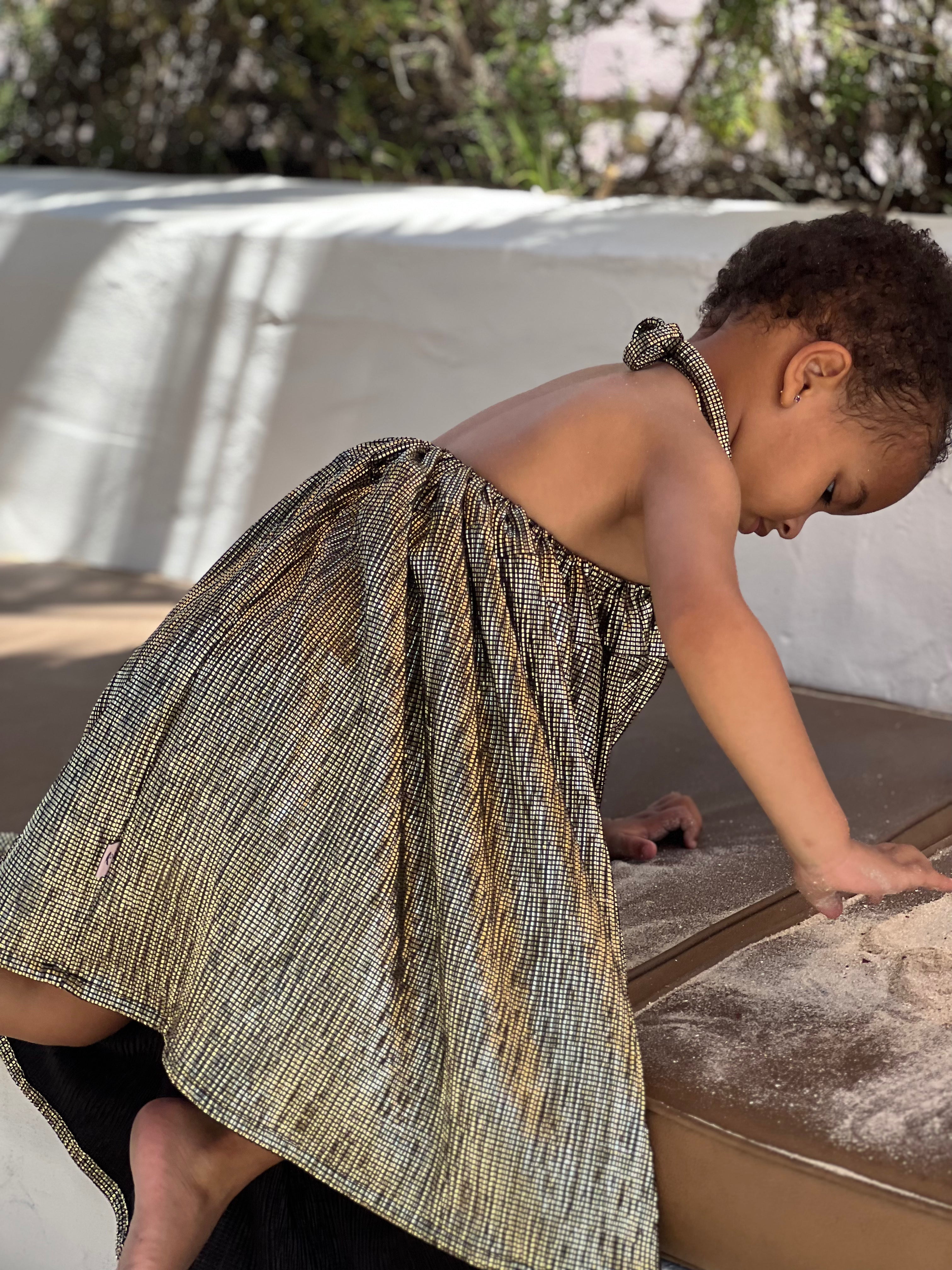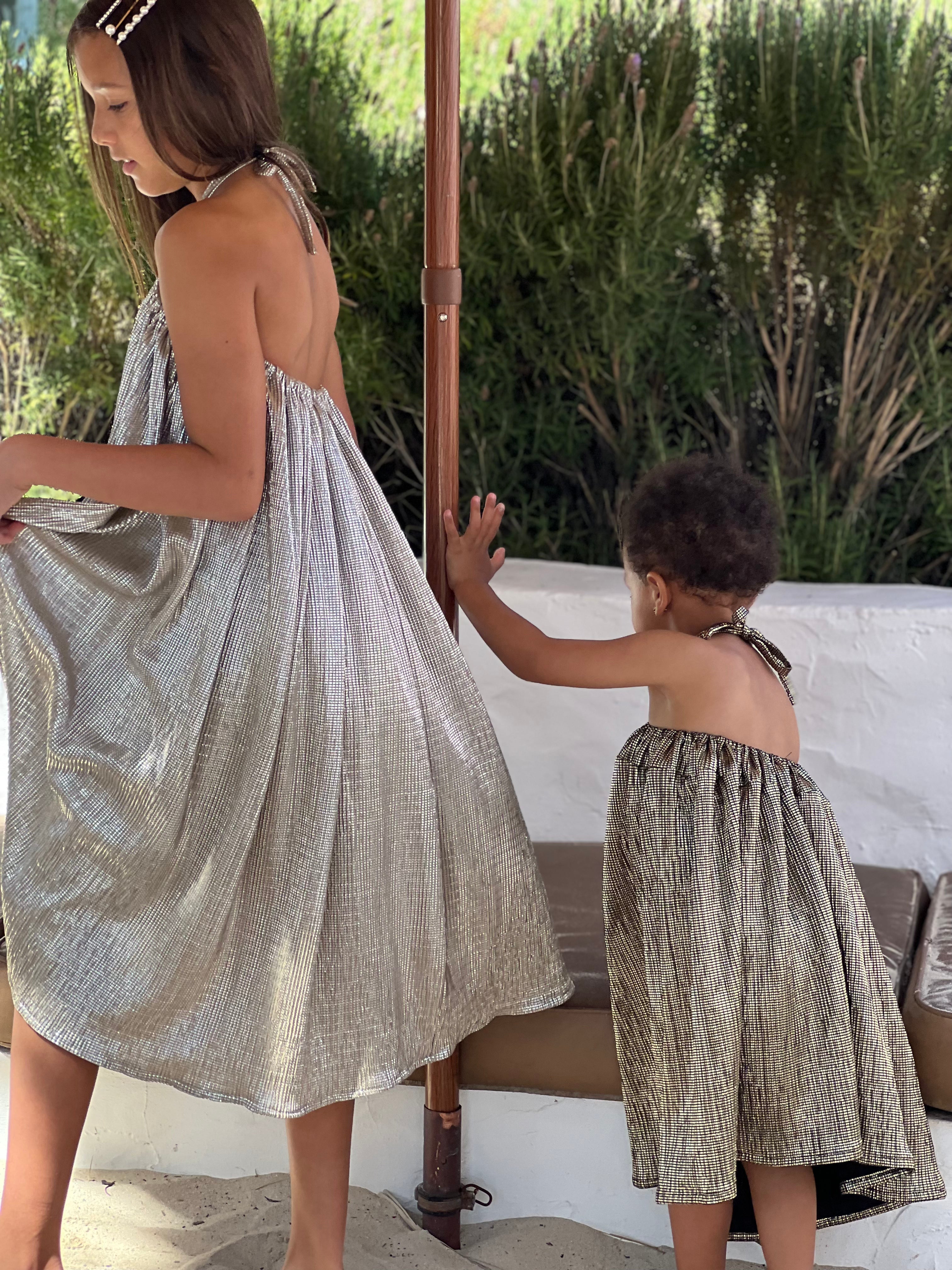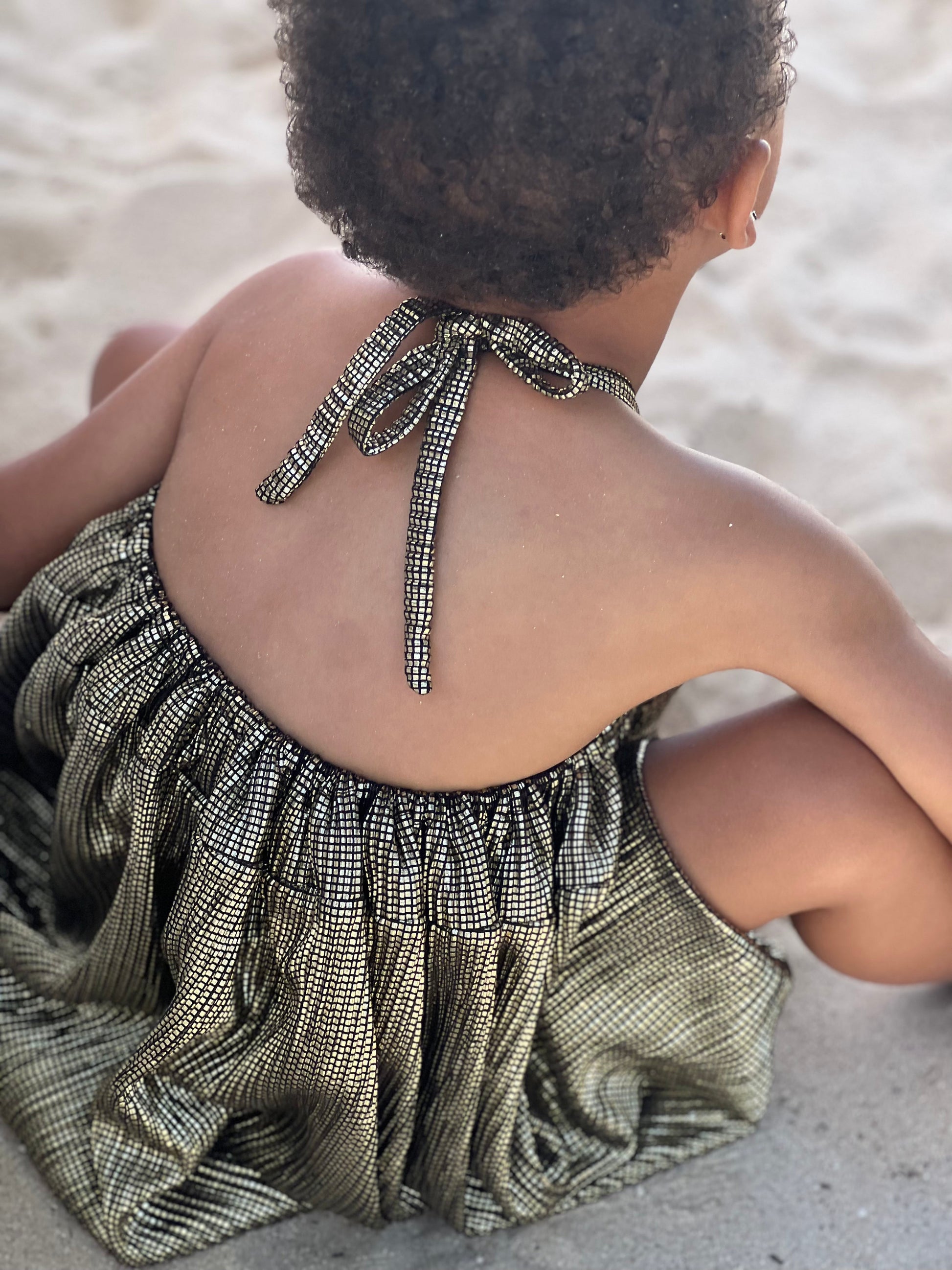 Our Festive Halter shimmier than the shimmiest, shinier than the shiniest. This dress arrived just in time to join all the celebrations with you. This soft and flowy dress, makes it the perfect play and dress up dress with all the comfort and freedom. Care Guide & Fabric composition: 100% polyester, viscose backing lining
