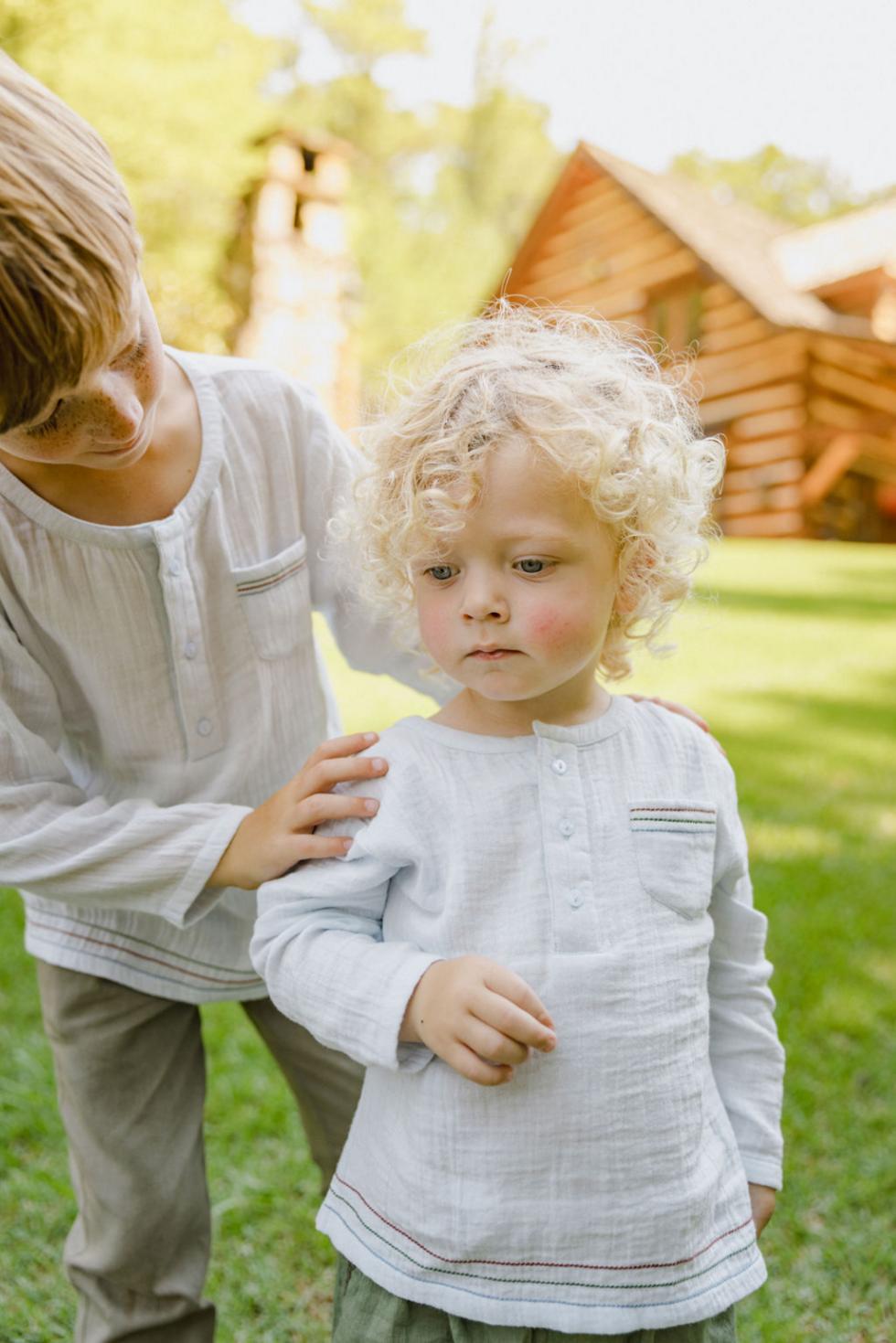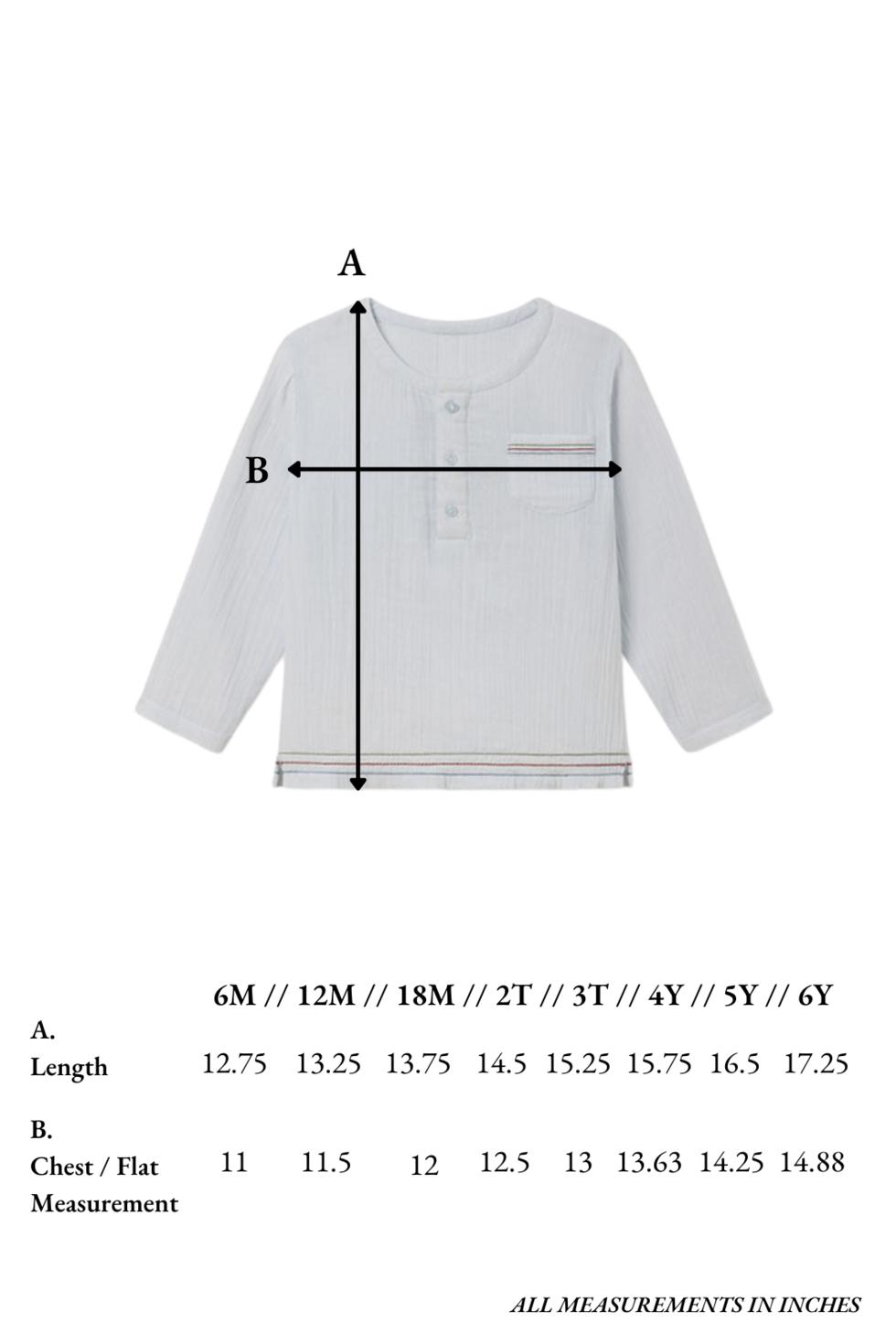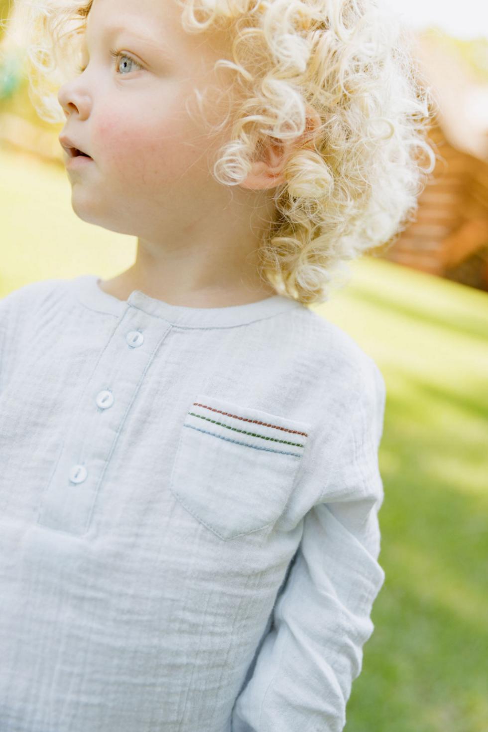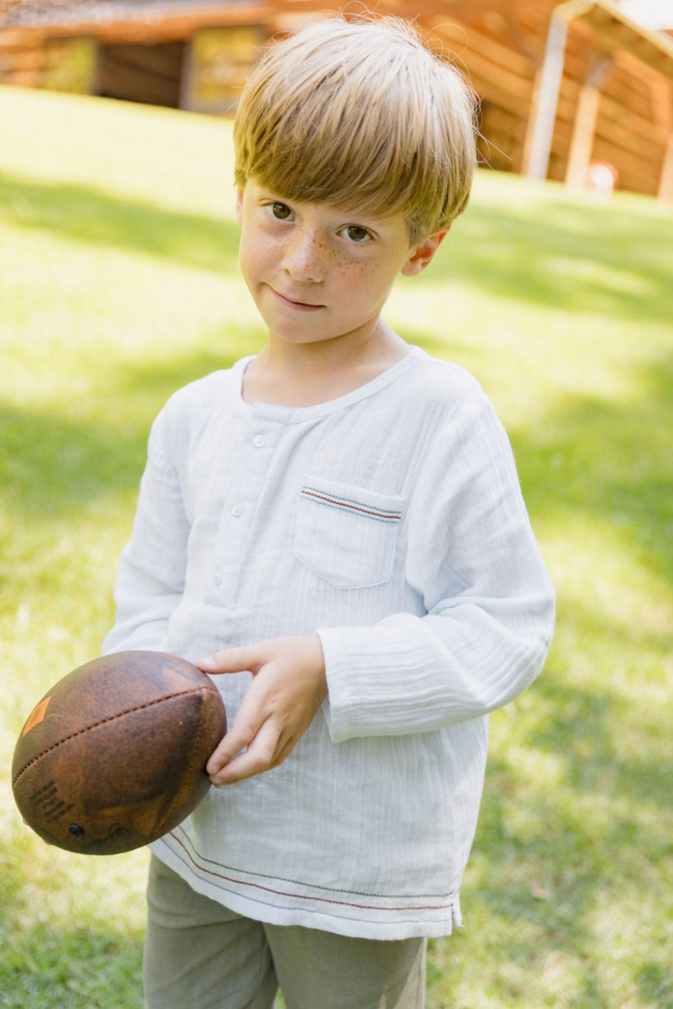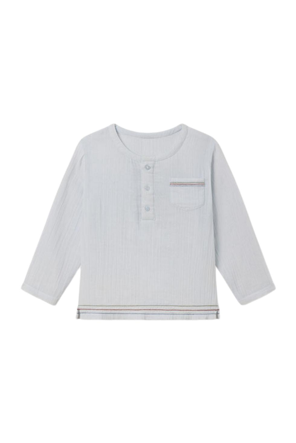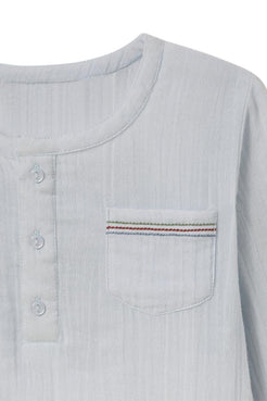 The David Top returns in a subtle light blue hue. Cut from ultra soft 100% double cotton gauze, this shirt features a class crewneck and a handsome three-button placket with button-covered snaps. A tri-color embroidery detail at the pocket and the bottom hem of burgundy, bandit blue, and spruce – contribute to the craftsman-quality shirt that will be a go-to for both play and style.
