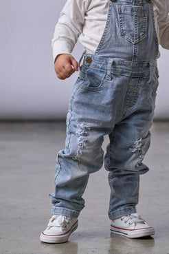 Our top selling distressed denim overalls are a must-have for the little trendsetter in your life. These overalls combine a modern, edgy look with the classic denim feel. Perfect for your fall adventures and pumpkin patch outings. Material + Wash