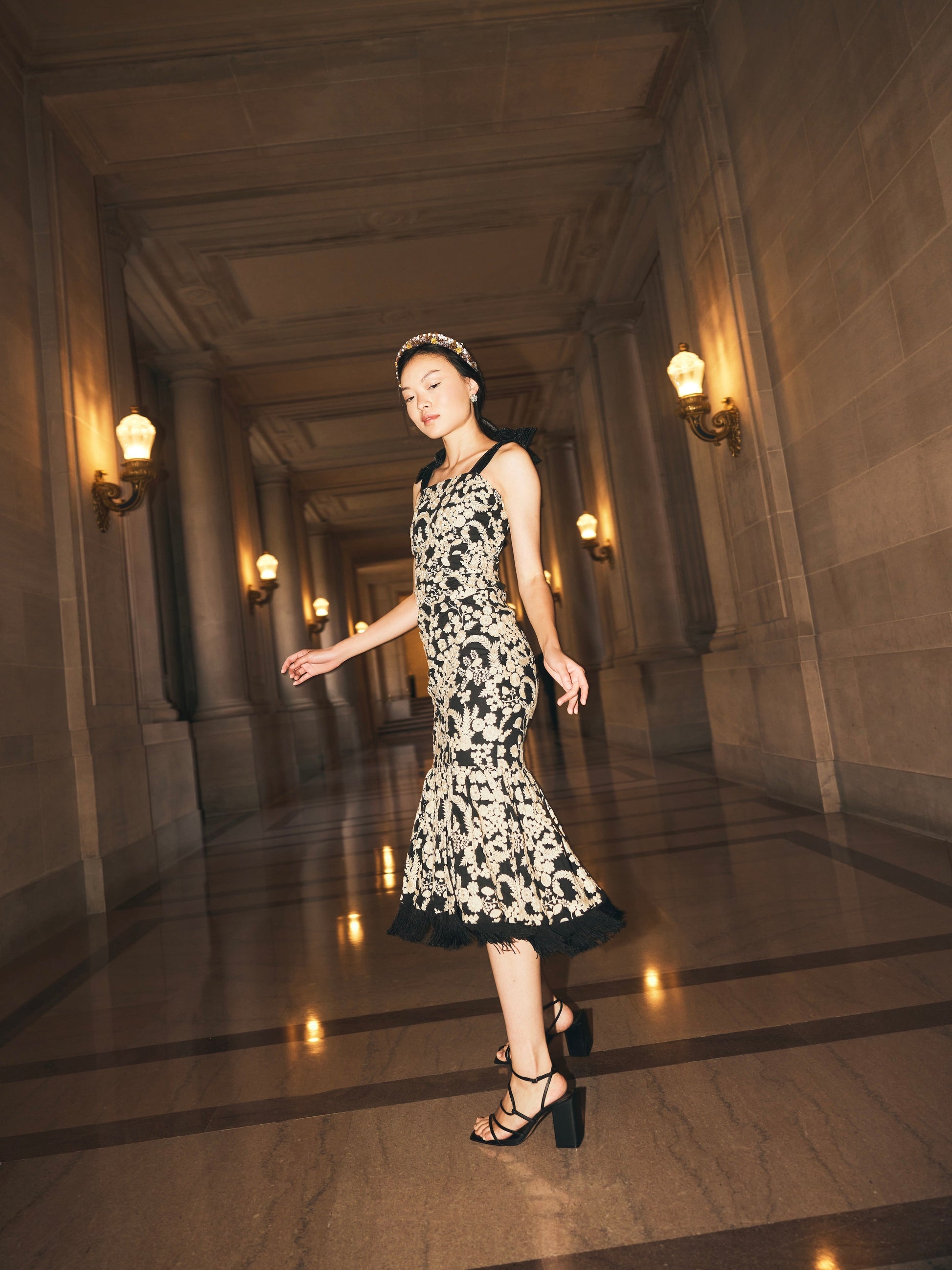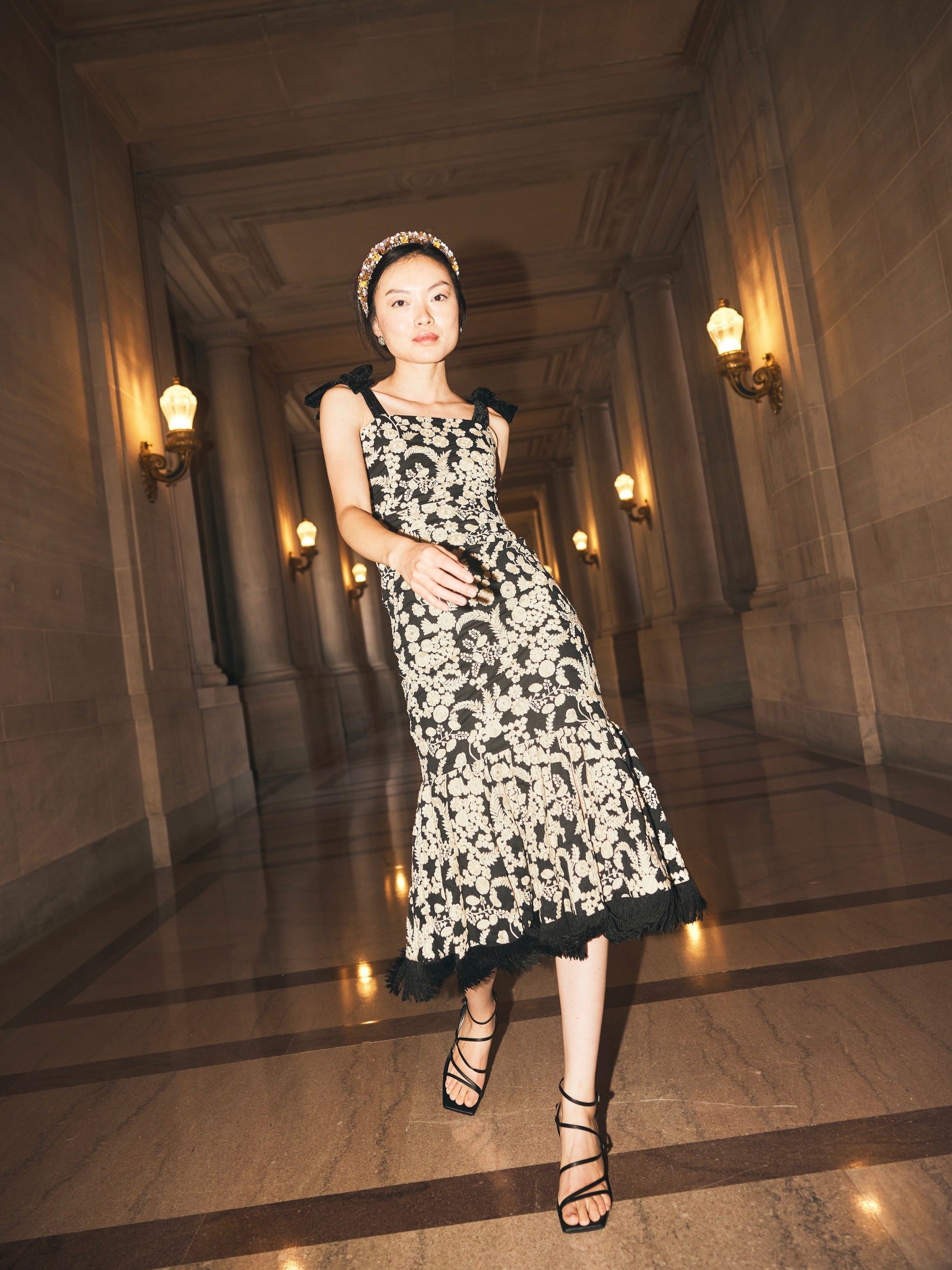 The intricate floral embroidery motif, that adorns this beautifully bold piece, gives a playful, fresh twist on embroidery for event dressing.