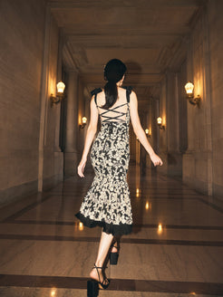 The Doris dress is a showstopper. Satin ribbon corset details at the back provide a beautiful juxtaposition to the fun fringe that dances on the hem.