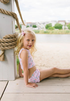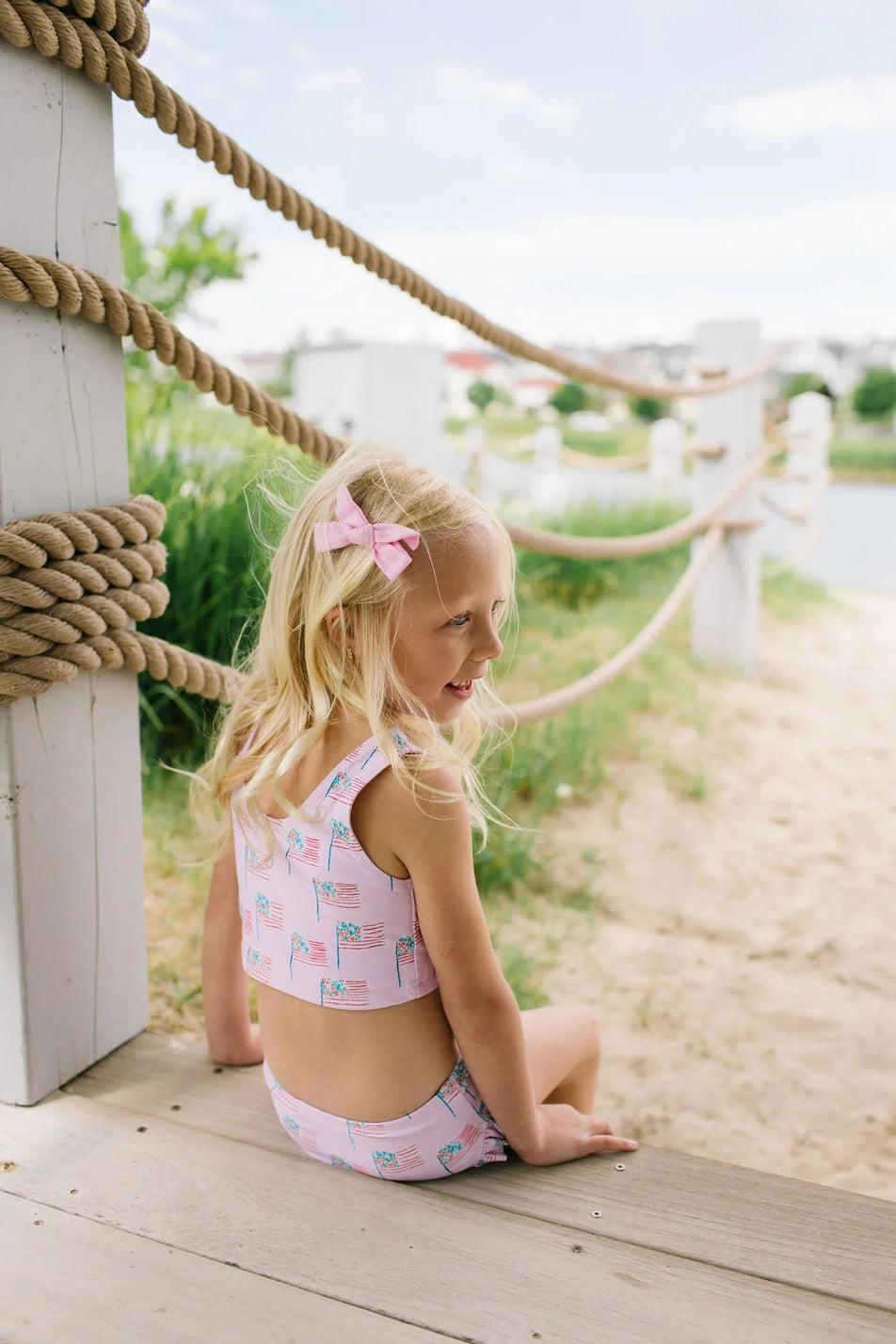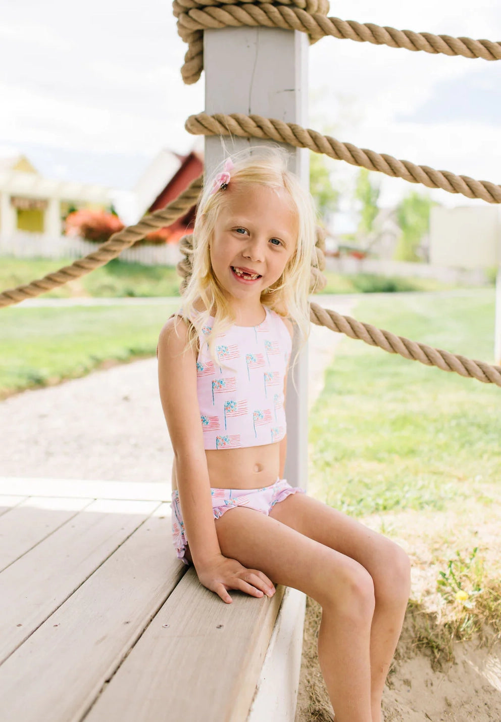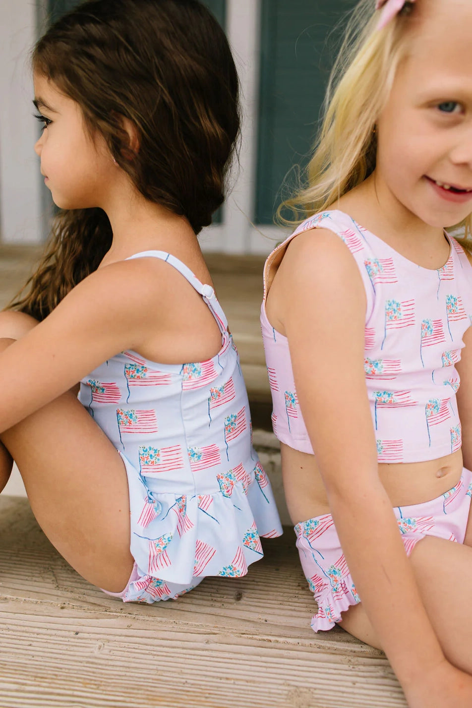 Make a splash this summer with the Ellie Swim Set, featuring a cropped tank-style top and matching bottoms, both adorned with sweet ruffle details. Crafted from UPF 50 protected fabric with a soft beige lining, this set keeps your little one protected while looking adorable in a patriotic print.