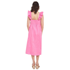 The Erin dress is the carefree, midi dress of warm weather dreams made in our stretch cotton poplin. Ruffle-trimmed shoulder straps with a deep v neckline, princess seams and smocked back detailing make this the dress to always throw on.