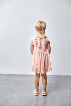 This simple yet beautiful dress is featuring a round neck with ties at the back and a super soft, brushed jersey fabric. Fit and flare silhouette with generously shirred skirt is perfect for a special event or family pictures but also comfortable enough for everyday adventures. Tiny shrimps all-over print is our fave this season.