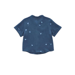 Hidden placket with snaps Stand up collar with tab Rolled up and tucked sleeve 100% cotton gauze fabric