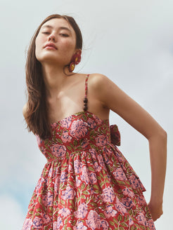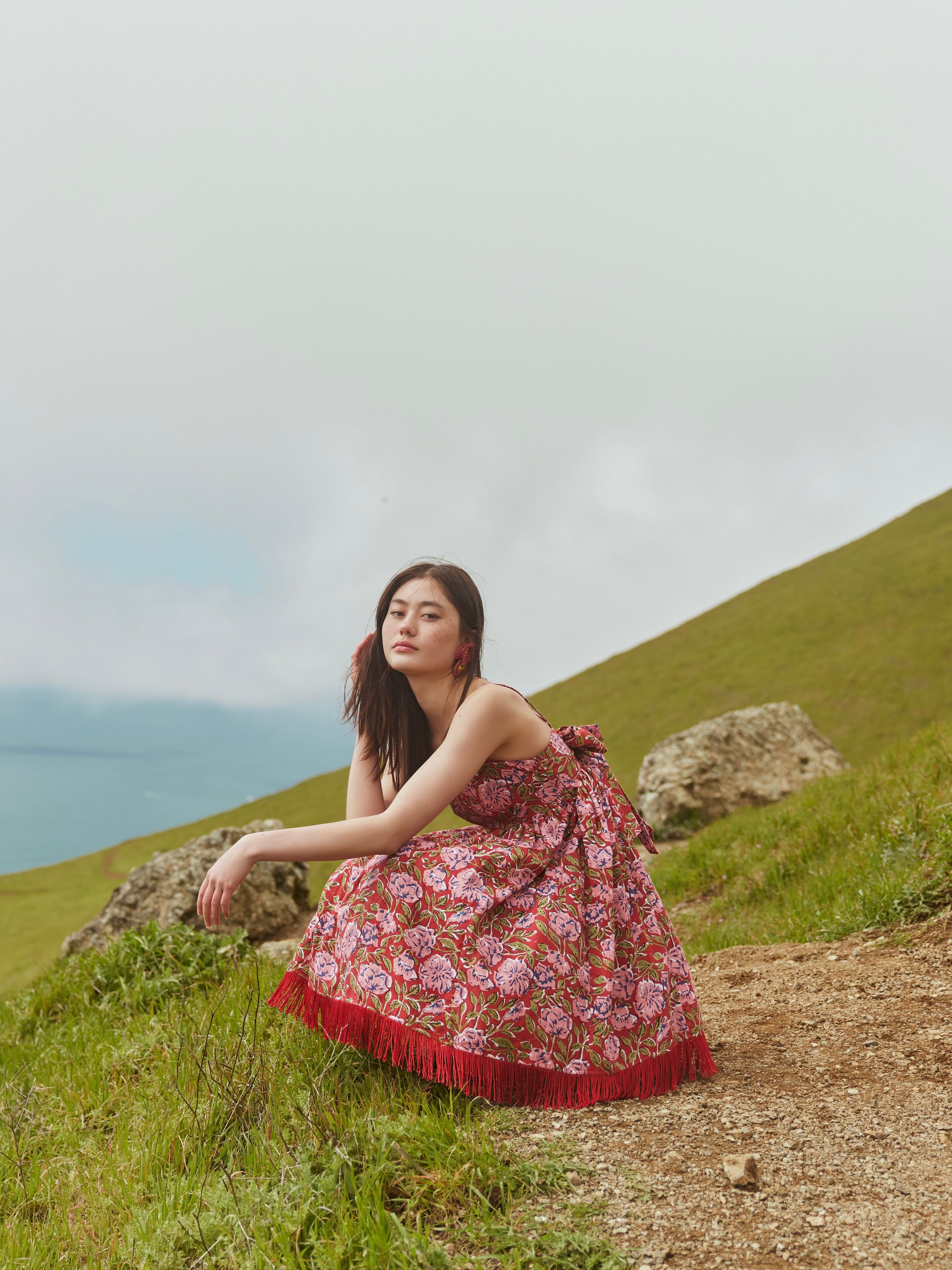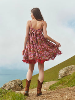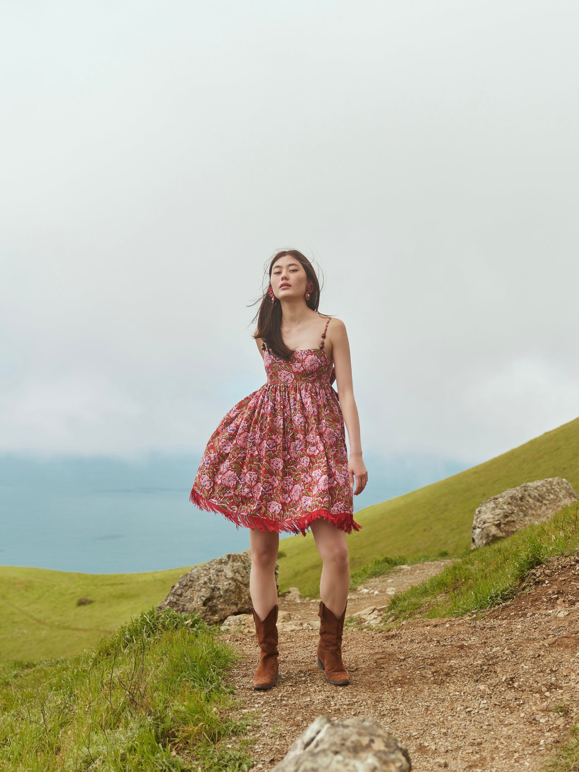 The mini version of our best-selling midi, the Gavin is a fun & flirty dress with tonal alabaster fringe at the hem. Wooden beads placed on the straps impart a sense of wearable jewelry. The full, flowing skirt and empire waist flatter the silhouette, while allowing you to twirl with ease. Intricately woven gold lurex touches add a sparkle to the dance, glistening in the sunlight