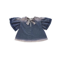This gorgeous top with raw finish sleeve ruffle (in fact, double ruffle!) and dip-bleached edges, works great with a matching denim skirt, shorts or leggings. Keyhole opening back with bow ties Elbow length flutter sleeve A-line shape Round neckline 100% cotton
