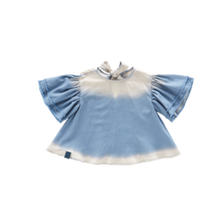 This gorgeous, flowy top with raw finish sleeve ruffle (in fact, double ruffle!) and dip-bleached edges, works great with a matching denim skirt, shorts or leggings. Keyhole opening back with bow ties Elbow length flutter sleeve A-line shape Round neckline 100% cotton