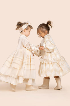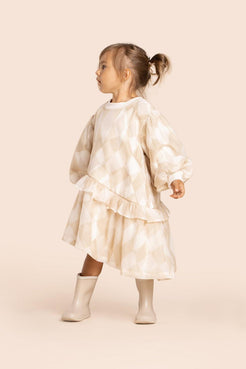 Rather epic harlequin pattern on both sheer top layer and cozy terry lining creates a cool optical illusion of constant movement. Hi-low diagonal skirt cut and puffy sleeves add to the edgy vibe. Also available in baby girls sizes!