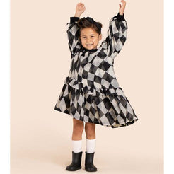 Rather epic harlequin pattern on both sheer top layer and cozy terry lining creates a cool optical illusion of constant movement. Hi-low diagonal skirt cut and puffy sleeves add to the edgy vibe. Also available in baby girls sizes!