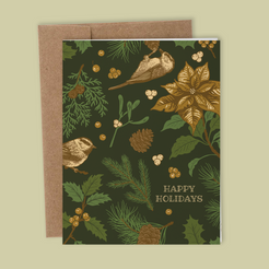 A festive and thoughtfully designed greeting card featuring an original "Happy Holidays" illustration from Mustard Beetle. Printed on sturdy 80lb matte cover stock with a smooth finish, this limited edition card offers a blank interior for your personal message and comes paired with a kraft envelope. Measures 4.25x5.5".