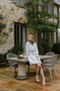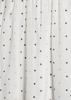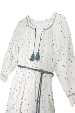 The Isla Dress just makes us happy. New for spring, the flowy silhouette with dramatic full sleeves can be worn loose or belted at the waist with the optional tassel sash, which comes in a muted blue to match our custom Confetti Dot fabric that's embroidered with tiny flecks of soft color—pink, green, blue, and yellow. The neck is elastic, which is a bonus for quick changes and nursing moms.