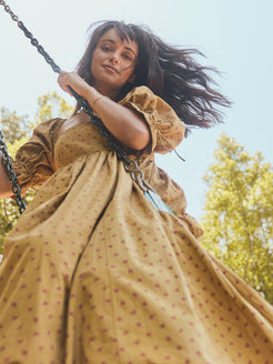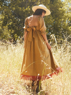 Jocelyn is a sister to our best-selling Gavin Midi, a captivating dress accented with rose colored fringe at the hem. It has romantic puff sleeves designed to be worn off the shoulder, and an adjustable tie back. The full, flowing skirt and empire waist flatter the silhouette, while allowing you to twirl and dance with ease