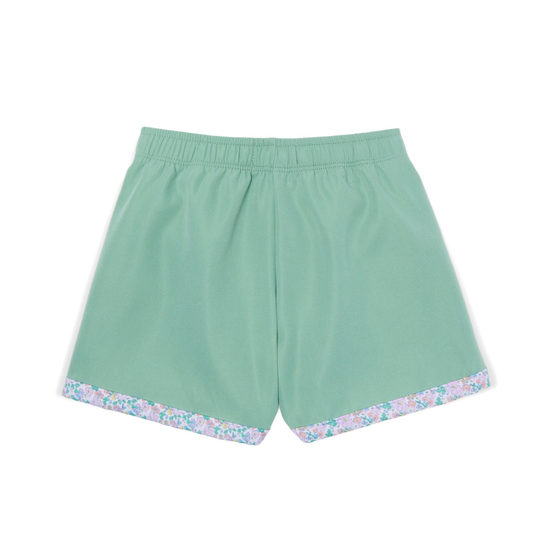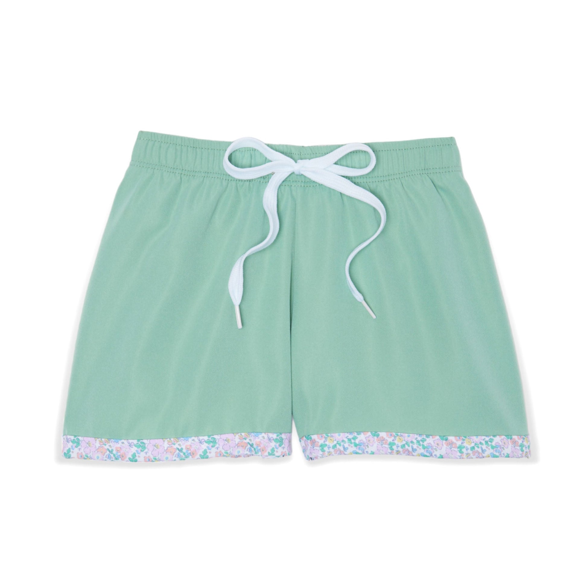 Green swim trunk with exclusive floral print trim. Drawstring and elastic waistband. Inside stretch liner for comfort...