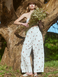 Introducing the Kirby pants - a blend of refinement and comfort, drawing inspiration from the iconic silhouettes of the 1940s. Adorned with delicate rose embroidery in four colors throughout. Delicate ruffle detailing the seams, while the back is finished with a self-tie for a customized fit. Designed with comfort in mind, the waistband features elasticized elements, ensuring ease of movement. An intricate rose vine embroidery adorns the high-waisted waistband, seamlessly tying together the floral motif that graces the entirety of the pants. Wear with the Camila Top for a full flower moment or pair with a simple tee for a casual look.