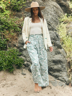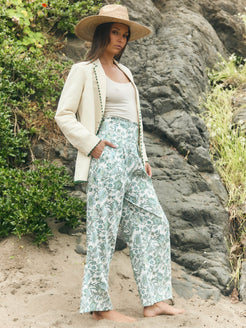 Introducing the Kirby pants - a blend of refinement and comfort, drawing inspiration from the iconic silhouettes of the 1940s. Adorned with mint and blue floral print. Delicate ruffle detailing the seams, while the back is finished with a self-tie for a customized fit. Designed with comfort in mind, the waistband features elasticized elements, ensuring ease of movement. Wear with the Hannah Top for a full flower moment or pair with a simple tee for a casual look.