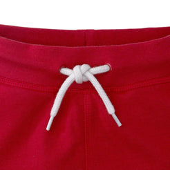 Pull on short with drawstring on kid sizes; faux drawcord on baby sizes.