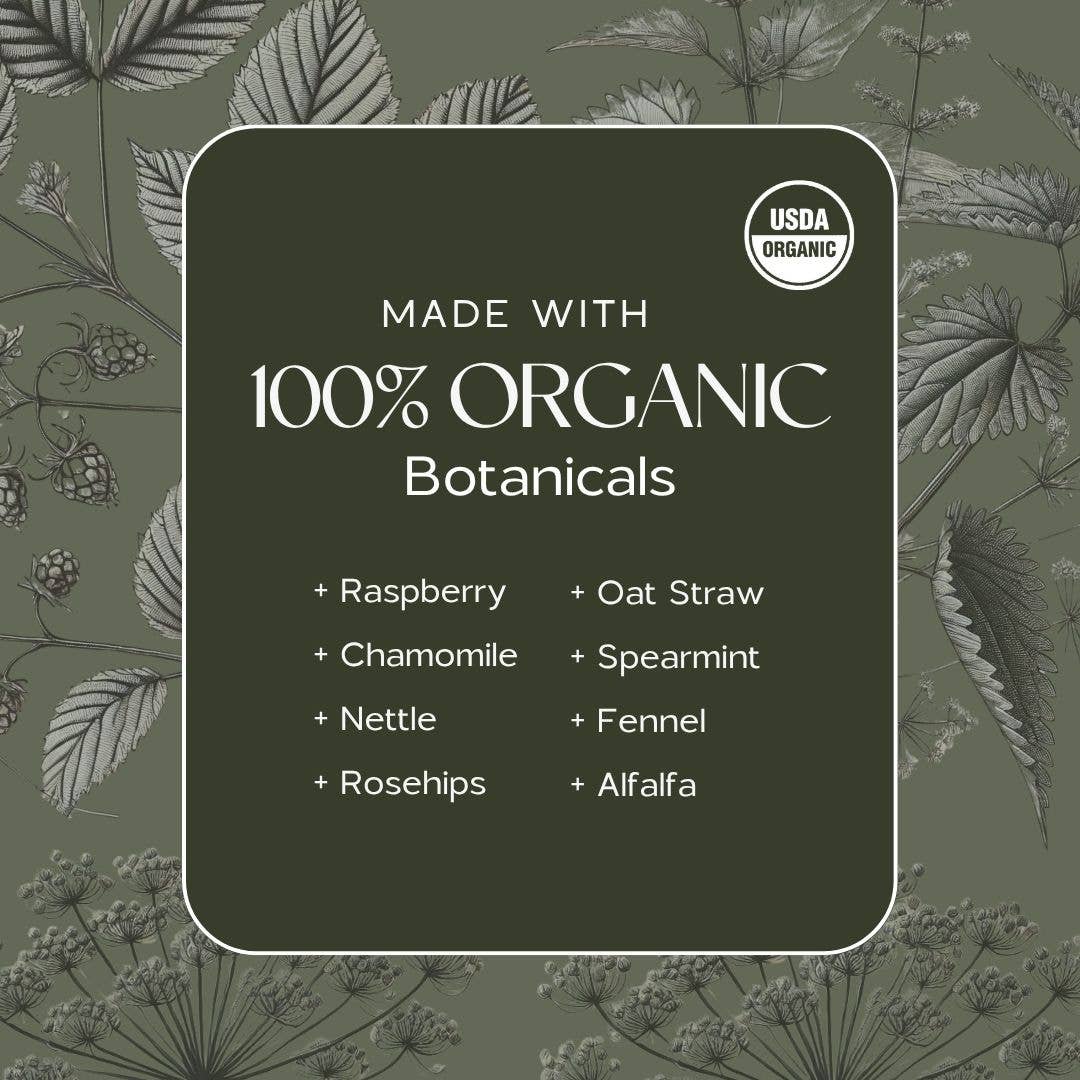 Organic and/or wildcrafted: Red Raspberry Leaf, Nettle, Alfalfa, Oat Straw, Fennel, Lemon Balm, Chamomile, Rose
