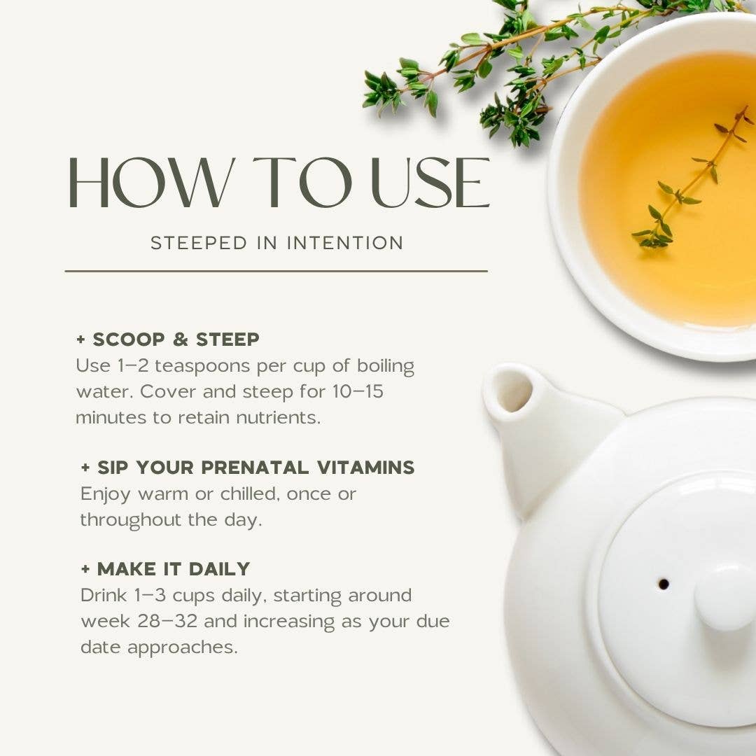 Steep 1–2 tsp per cup in hot water for 5–10 minutes. Enjoy daily throughout pregnancy and postpartum. Consult with your healthcare provider if unsure when to begin uterine toning herbs.
