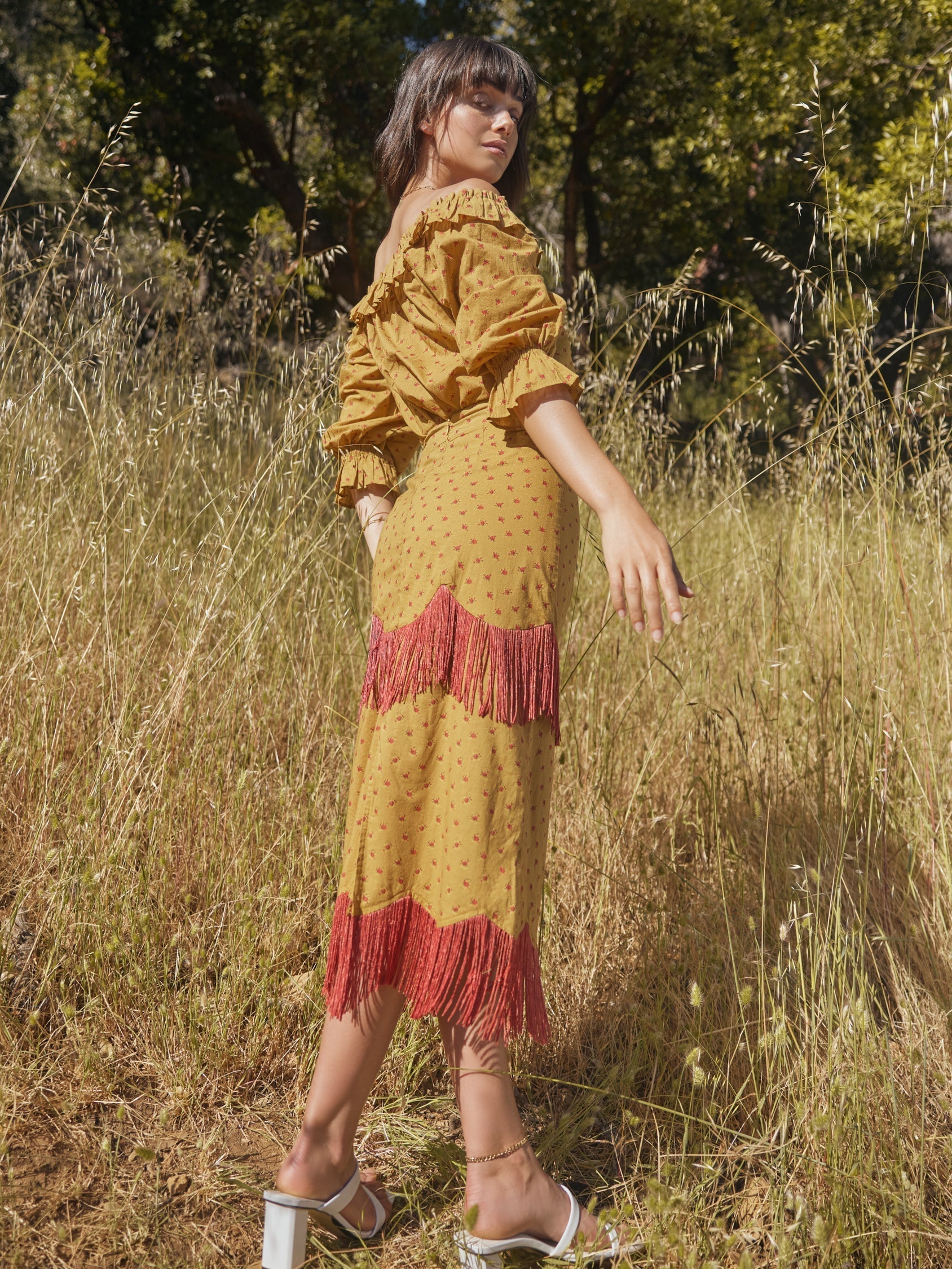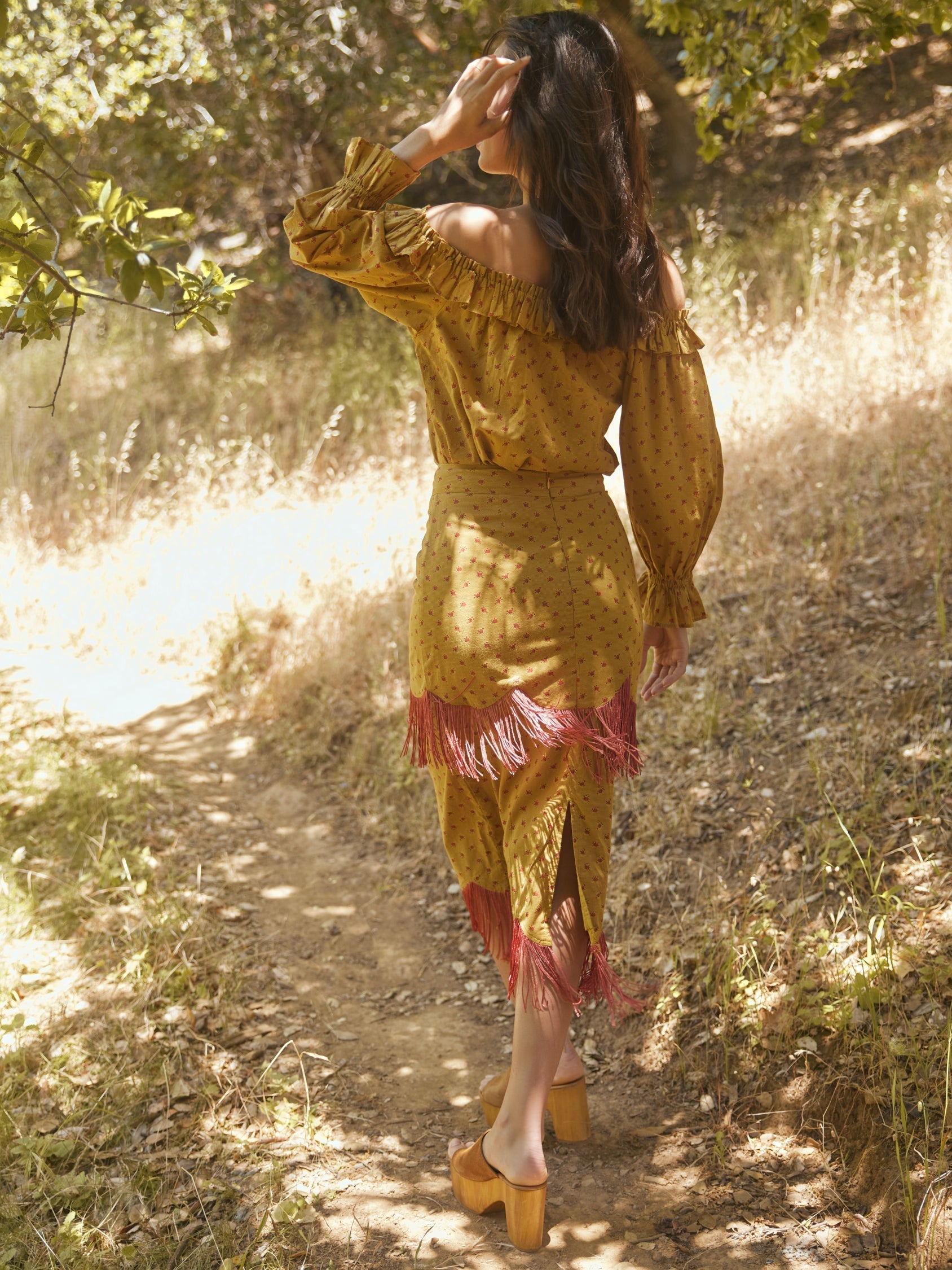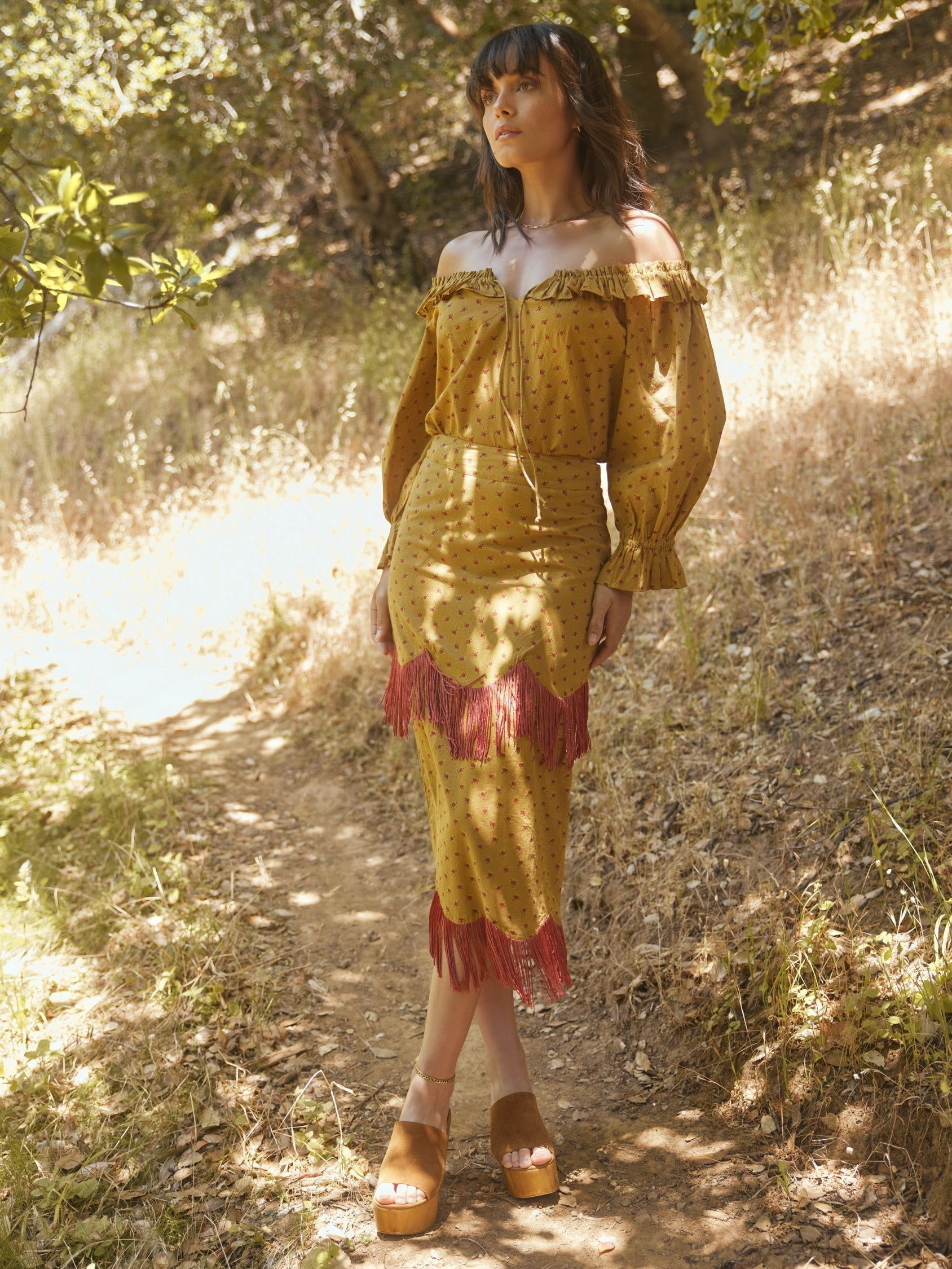 The Liliana is a relaxed fit peasant top with a tie ruffled neckline that can be worn on or off the shoulder. Its full length sleeves and neckline have a bit of elastic for for easy wear. Its micro ditsy floral print and honeyed color make it perfect for seasonal transitions. Liliana can be worn with the Carter Scalloped Fringe Skirt