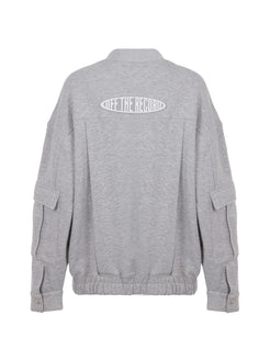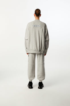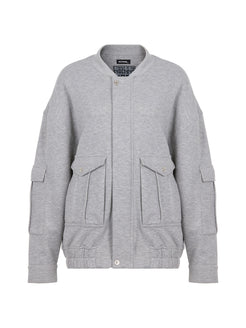 Loose-fit bomber jacket with front zipper and snap detail, large flap pockets on the front and sleeves, and elasticated hem