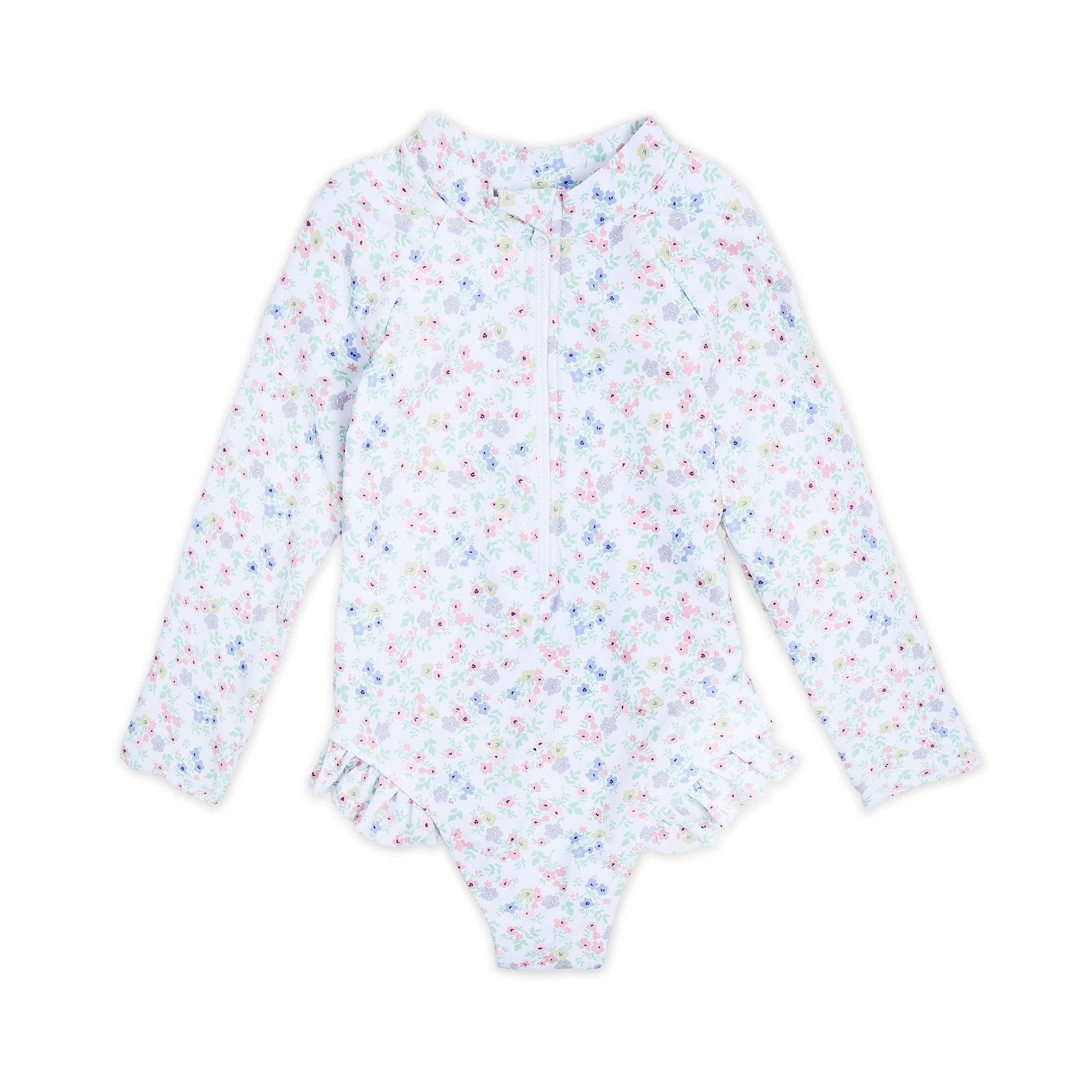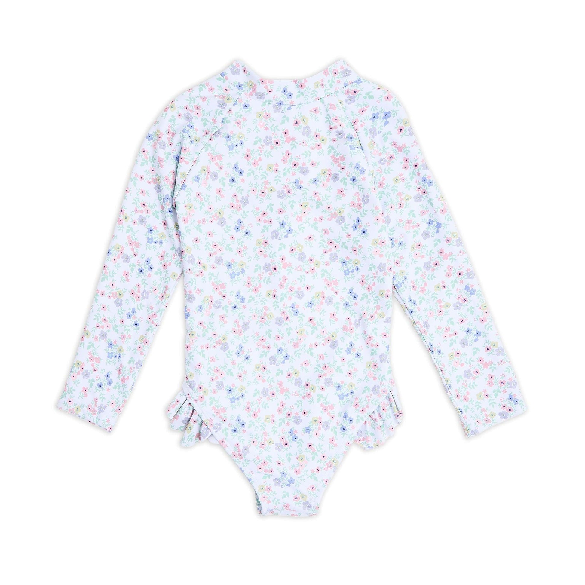 Rashguard swimsuit in an exclusive floral print. Zip up front for easy dressing. UPF50+ and quick dry capacity. Composition: Recycled 80% polyester, 20% elasten. Care: hand wash with like colors lay flat to dry do not iron do not bleach