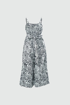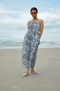 The playful Mafalda is made from 100% hand dyed cotton. Details include wide culotte legs, a button front placket, deep inseam pockets, and an attached sash. The fitted bodice has a panel of stretch shirring at the back, and the shoulder straps are elasticated at the back for fit and ease of movement.