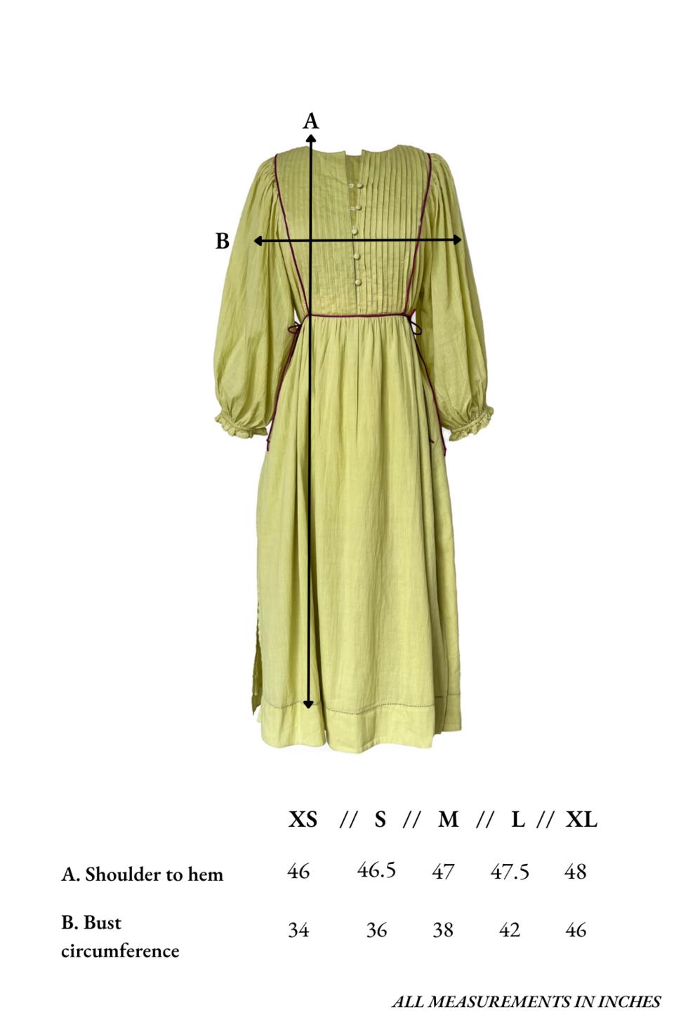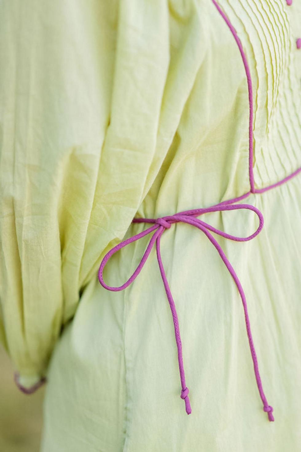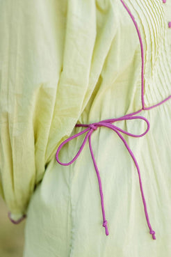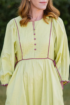 The Mallie Dress invites us into the season with a bright Chartreuse palette. With intricate pintucks on the bodice, luxe and functional fabric-covered buttons, and contrast piping, this silhouette exudes effortless elegance. Bishop wrist-length sleeves allow for a freeing range of motion and give the practical option to adjust the length. Ties at the natural waist allow this style to be cinched or worn loose, and a mid-length hem features a playful slit, adding a little skin to a style that can take you everywhere.