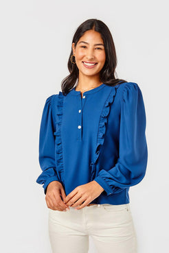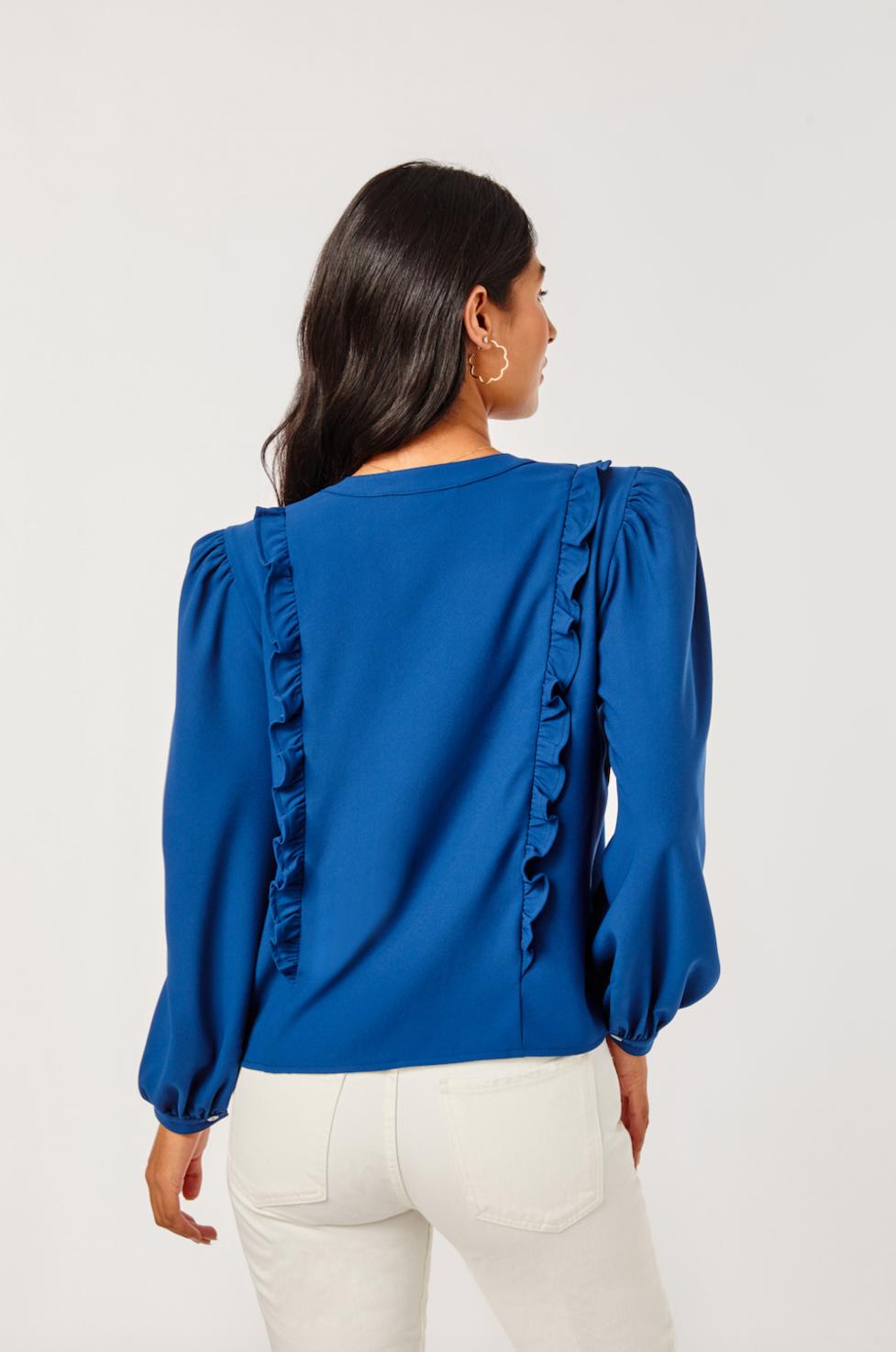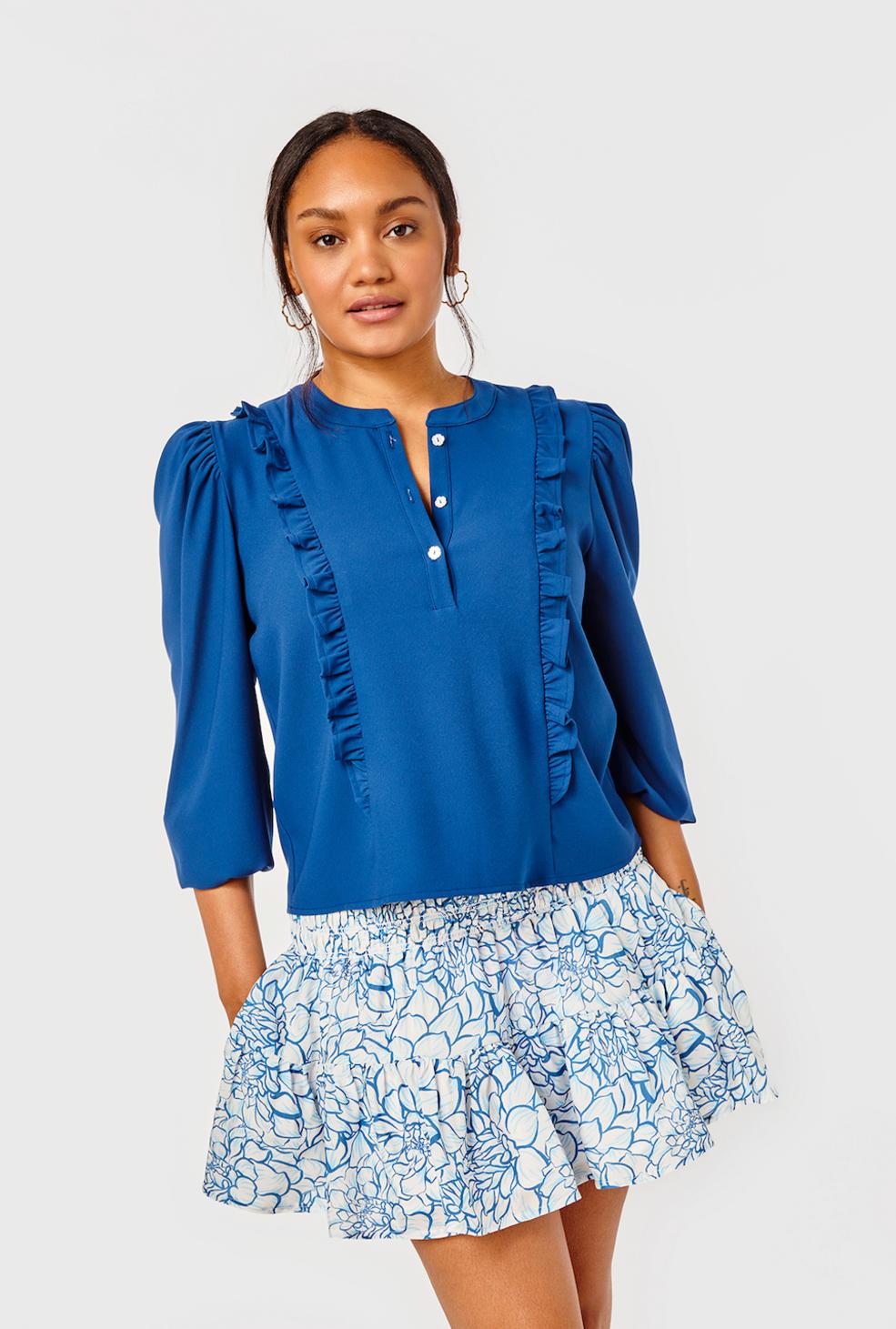 The Margaret blouse is a long sleeve boxy silhouette with a front and back ruffle detail. The sleeve cuffs and down t...