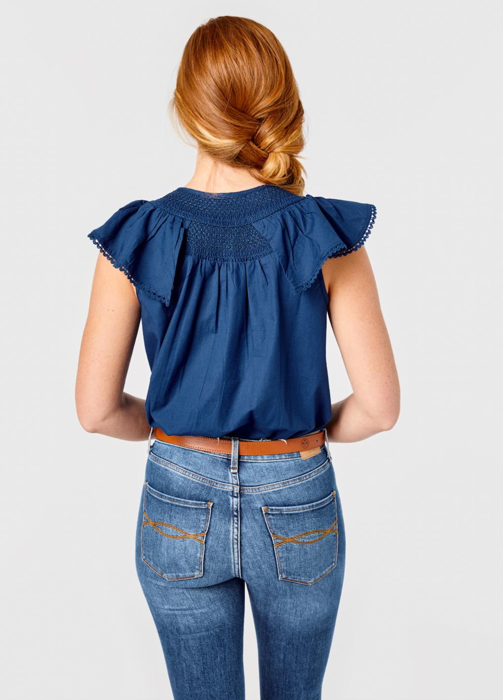 Our Maria top is the perfect top to be paired with your favorite Cartolina bottom or a pair of jeans. It Features a curved smocked yoke around the neckline with custom placement embroidery. A-line silhouette with a flutter sleeve inset with eyelet trim.