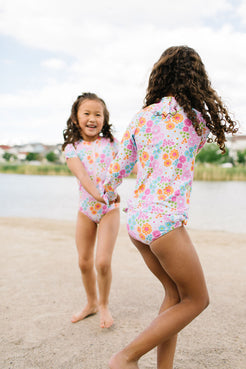The Mia Swimsuit features a protective long sleeve rash guard designed with delicate keyhole openings at the wrists, each accented with a sweet bow detail. The back of the swim top includes three snaps for easy on and off. The look is perfectly complemented by detached bottoms adorned with matching bows, combining function and style for sun-safe swim days.
