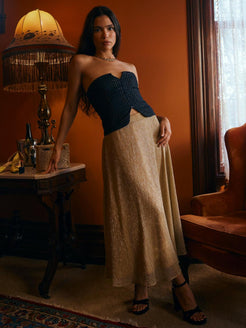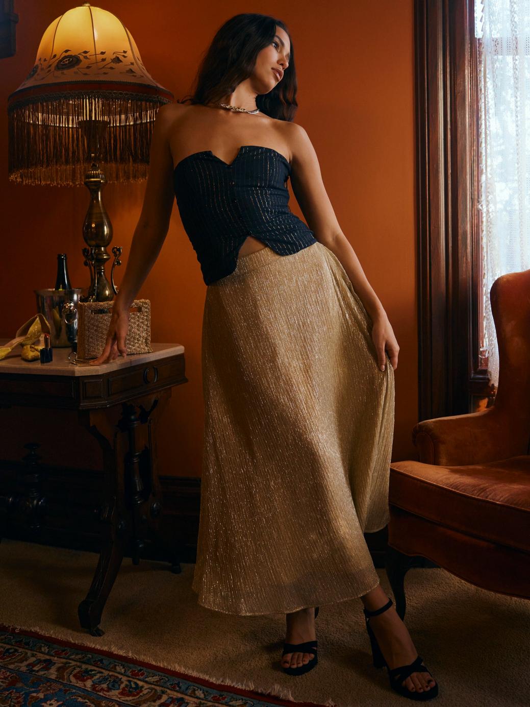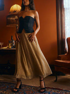 Meet Michelle- a cropped waistcoat crafted in heavy cotton with lurex pinstripe detailing. Vintage inspired silhouette carries details seen in men's waistcoats- center buttons and mini front pockets. Invisible side zipper closure elastic back details offer a comfortable fit. This strapless top is designed to be paired with a martini.